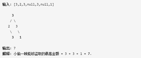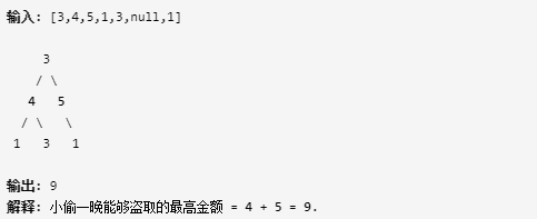 在上次打劫完一条街道之后和一圈房屋后,小偷又发现了一个新的可行窃的地区。这个地区只有一个入口,我们称之为“根”。 除了“根”之外,每栋房子有且只有一个“父“房子与之相连。一番侦察之后,聪明的小偷意识到“这个地方的所有房屋的排列类似于一棵二叉树”。 如果两个直接相连的房子在同一天晚上被打劫,房屋将自动报警。