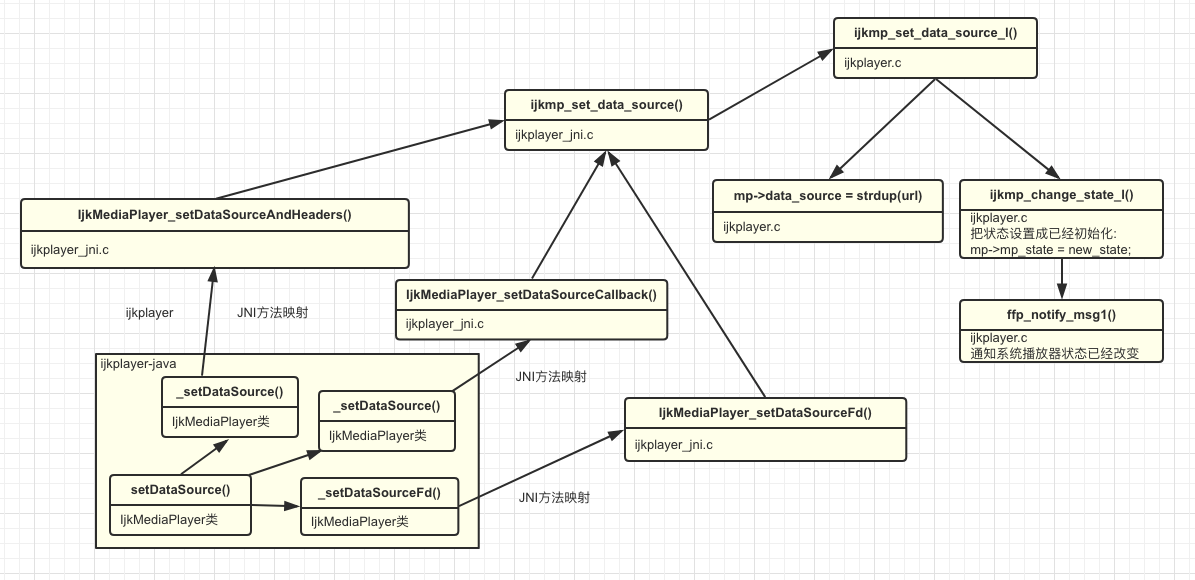 setDataSource()是ijkplayer设置播放文件的接口,支持本地文件和网络URL文件播放。下图就是其调用的基本流程: