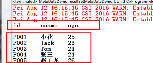 public class MetaDataDemo { // ※元信息1:通过con获得DatabaseMetaData(数据库元信息)---数据库连接信息、数据库名、表名 @Test public void databaseMetadataDemo() throws Exception { // 获取数据库的元信息 Connection con = ConnsUtil.getConn(); // ********关键 DatabaseMetaData dm = con.getMetaData(); // 获取此 JDBC 驱动程序的名称。 System.out.println(dm.getDriverName()); // 获取此 JDBC 驱动程序的主版本号。 System.out.println(dm.getDriverMajorVersion()); // 获取在此数据库中在同一时间内可处于开放状态的最大活动语句数。--返回结果为零意味着没有限制或限制是未知的 System.out.println(dm.getMaxStatements()); // 获取此驱动程序的主 JDBC 版本号。 System.out.println(dm.getJDBCMajorVersion()); // 还有很多方法,可以去API自己查 System.out.println("========================="); // 下面是动态获取数据库名 ResultSet rs = dm.getCatalogs(); // 相当于执行:show databases; while (rs.next()) { System.out.println(rs.getString(1)); // 进行元数据操作获得数据库名 } // 知道数据库的名字 con.createStatement().execute("use hncu"); // 动态获取表名 // 可以把参数null写成“%o%”进行模糊查询 ResultSet rs2 = dm.getTables("hncu", "hncu", null, new String[] { "TABLE" }); while (rs2.next()) { System.out.println(rs2.getString("TABLE_NAME")); // 进行元数据操作,获得表名 } } // ※元信息2:通过rs获得ResultSetMetaData(结果集元信息)---表头(每个字段名)、表格行数、列数 // 在知道数据库名和表名的情况下,把表头和表内容都查询出来。 @Test // 站在结果集的高度---也就是表格 public void resultSetMetaDataDemo() throws Exception{ Connection con1 = ConnsUtil.getConn(); Statement st = con1.createStatement(); //如果是跨库查询,sql:“数据库名.表名”----select * from 数据库.表名 String sql = "select * from stud";//我们的连接是hncu数据库的,访问hncu数据库直接写表名就可以 ResultSet rs = st.executeQuery(sql); //结果集的元信息 ResultSetMetaData rsmd = rs.getMetaData(); int columns = rsmd.getColumnCount(); //获得表格的列数 //输出整个数据表(包括表头) //表头 for(int i=0;i<columns;i++){ String columnName = rsmd.getColumnName(i+1); System.out.print(columnName+"\t"); } System.out.println(); System.out.println("------------------------"); //表内容 while(rs.next()){ for(int i=0;i<columns;i++){ String content = rs.getString(i+1); System.out.print(content+"\t"); } System.out.println(); } }