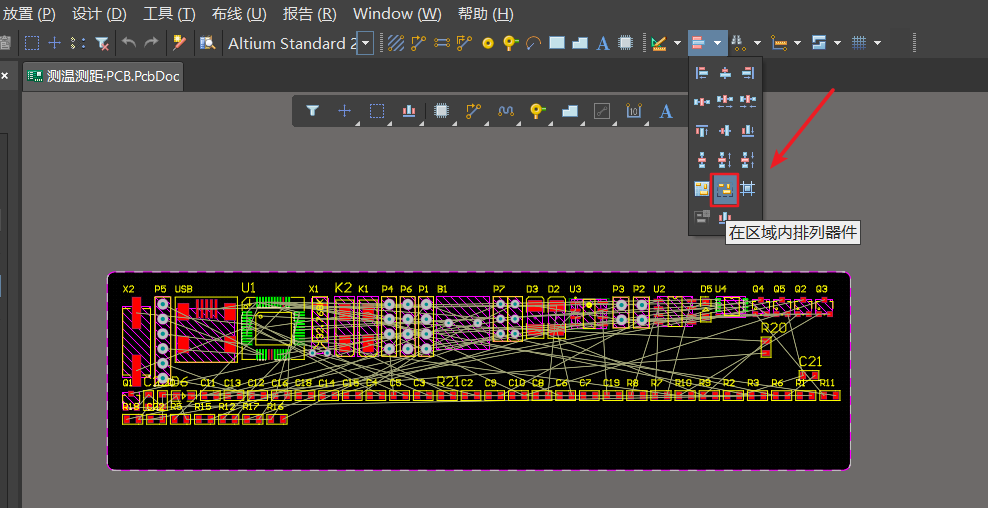 2.跳转到PCB界面,元件一并选中。再按 T+O+L ,画一个框。或者点击菜单栏下图这个"在区域内排列器件"