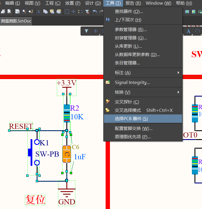 - 在原理图中选中器件,之后点击菜单栏:工具—>选择PCB器件。(或者在选中器件之后,按“T+S”)