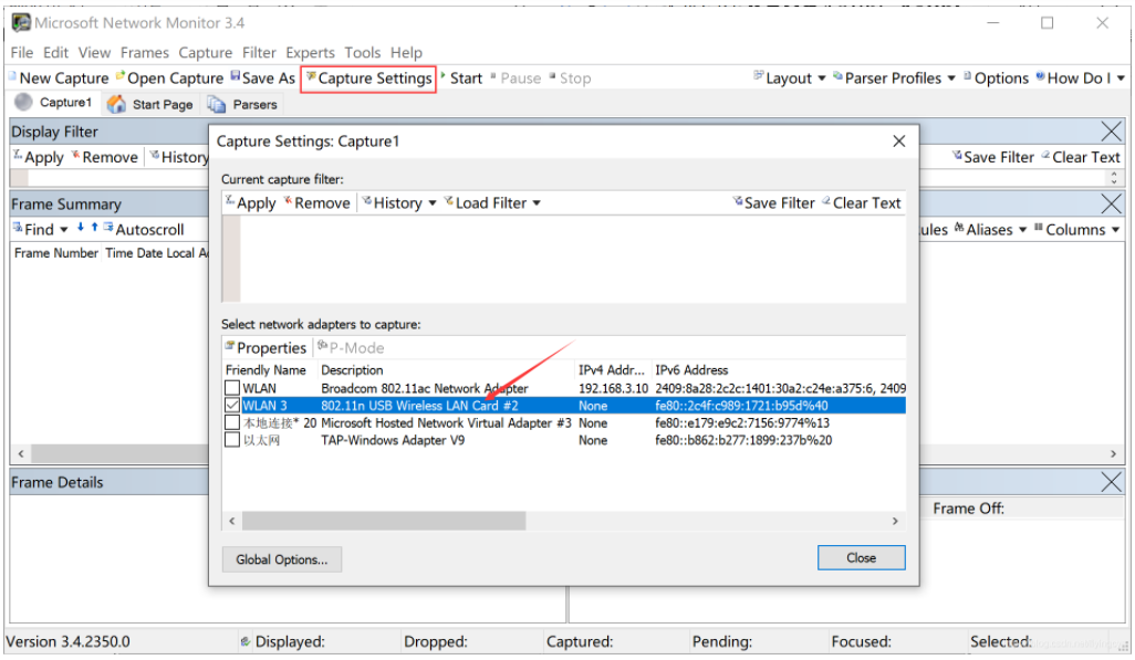 - 点击“Capture Settings”进入设置页面,可以看到当前选中的无线网卡