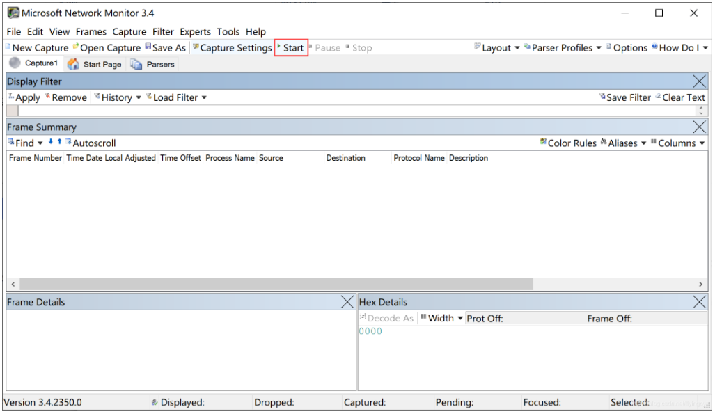 - 选中网卡后,点击“New Capture”,在弹出的页面中选中“Start”即可开始抓包。