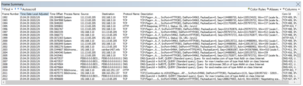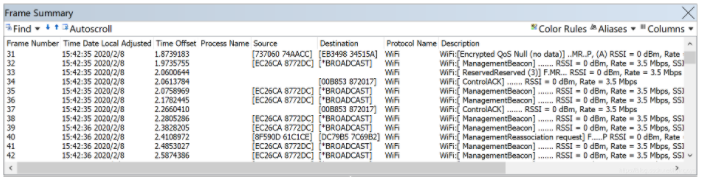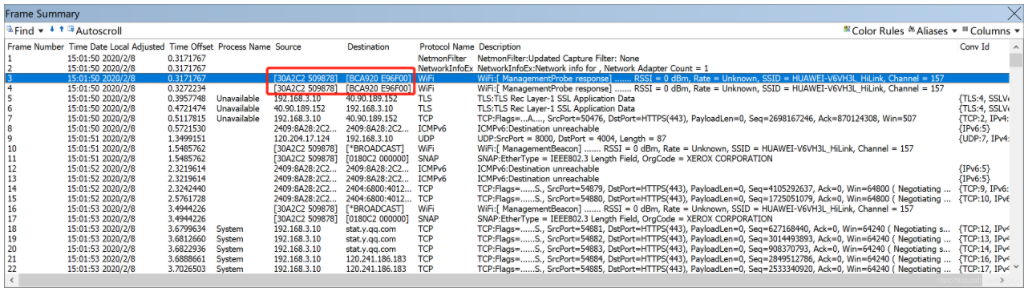 - 在“Frame Summary”框内可发现软件支持捕获到WiFi管理帧、TCP、UDP等数据包,同时软件还可显示“Process Name”、“Source”、“Destination”等网络信息。