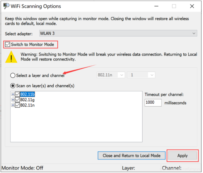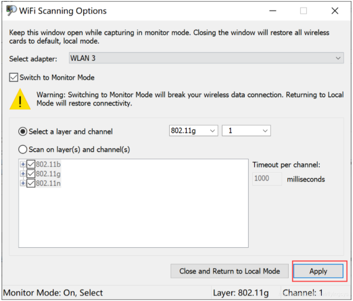 - 设置完成后,点击“Apply”,并且需要保持该页面为开启状态不能关闭,否则无线网卡自动退出“Monitor Mode”。
