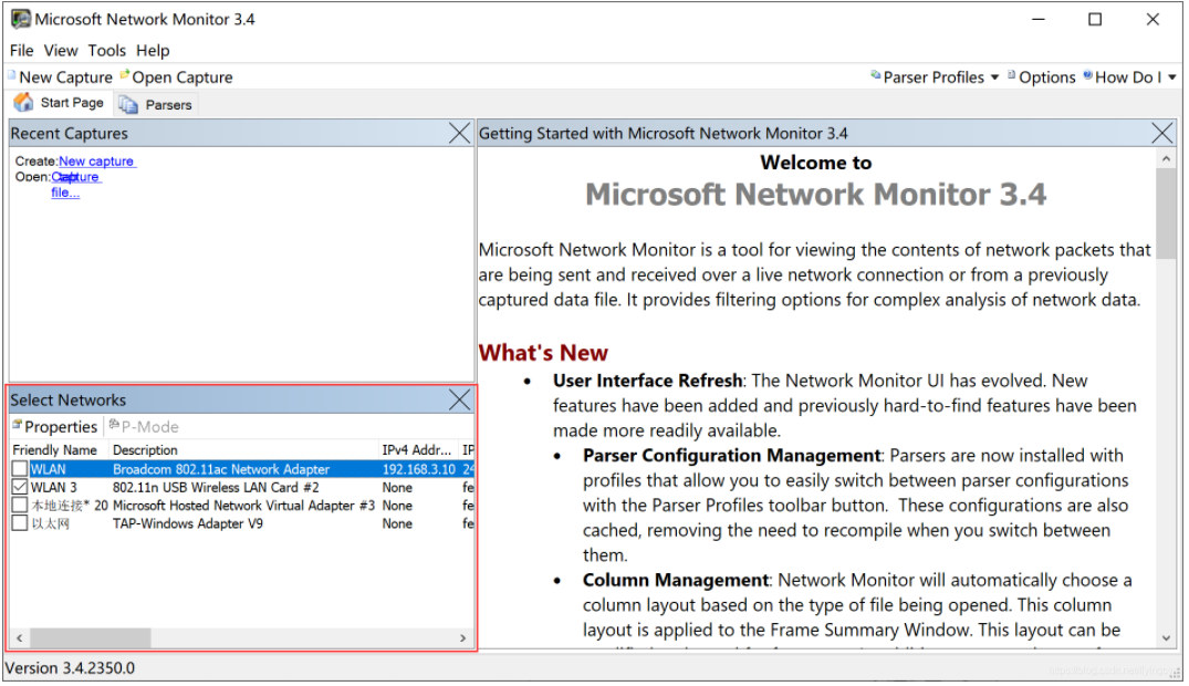 以管理员身份运行Microsoft Network Monitor 3.4,在“Select Networks”中会正确显示当前全部网卡,可以通过Friendly Name和Description找到我们要抓包的网卡。