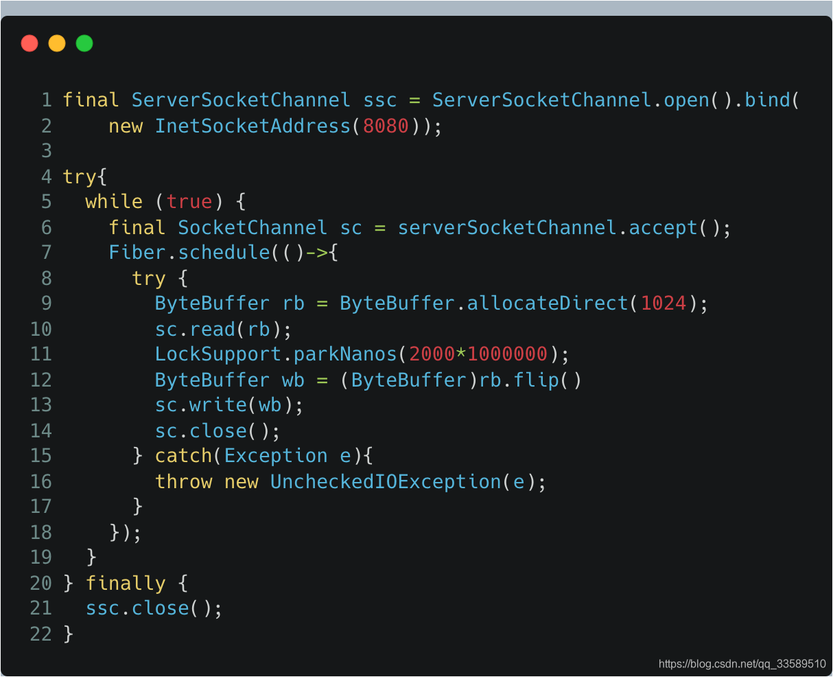 Loom在设计轻量级线程时,也充分参考了当前Java线程的使用方式,所以学习成本还是很低的。只需将new Thread(()->{…}).start()换成 Fiber.schedule(()->{})。