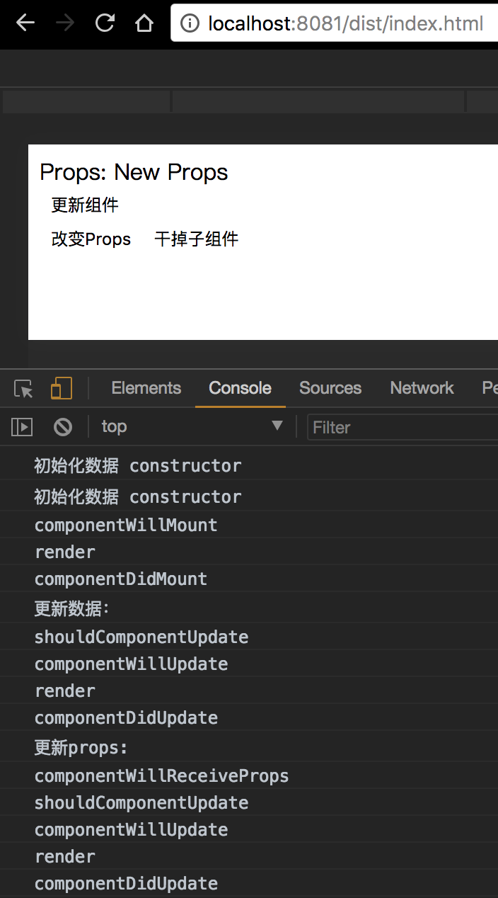 class App extends React.Component{ // 构造函数 constructor(props){ super(props) this.state = { data: 'Old Props', hasChild: true } console.log('初始化数据','constructor'); } onPropsChange(){ console.log('更新props:'); this.setState({ data: 'New Props' }); } onDestoryChild(){ console.log('干掉子组件:'); this.setState({ hasChild: false }); } render(){ return ( <div> { this.state.hasChild ? <Component data={this.state.data}/> : null } <button onClick={()=>{this.onPropsChange()}}>改变Props</button> <button onClick={()=>{this.onDestoryChild()}}>干掉子组件</button> </div> ); }
