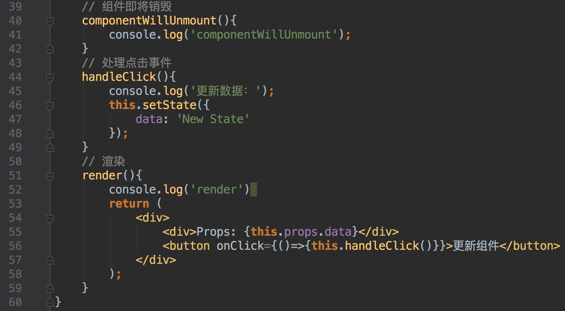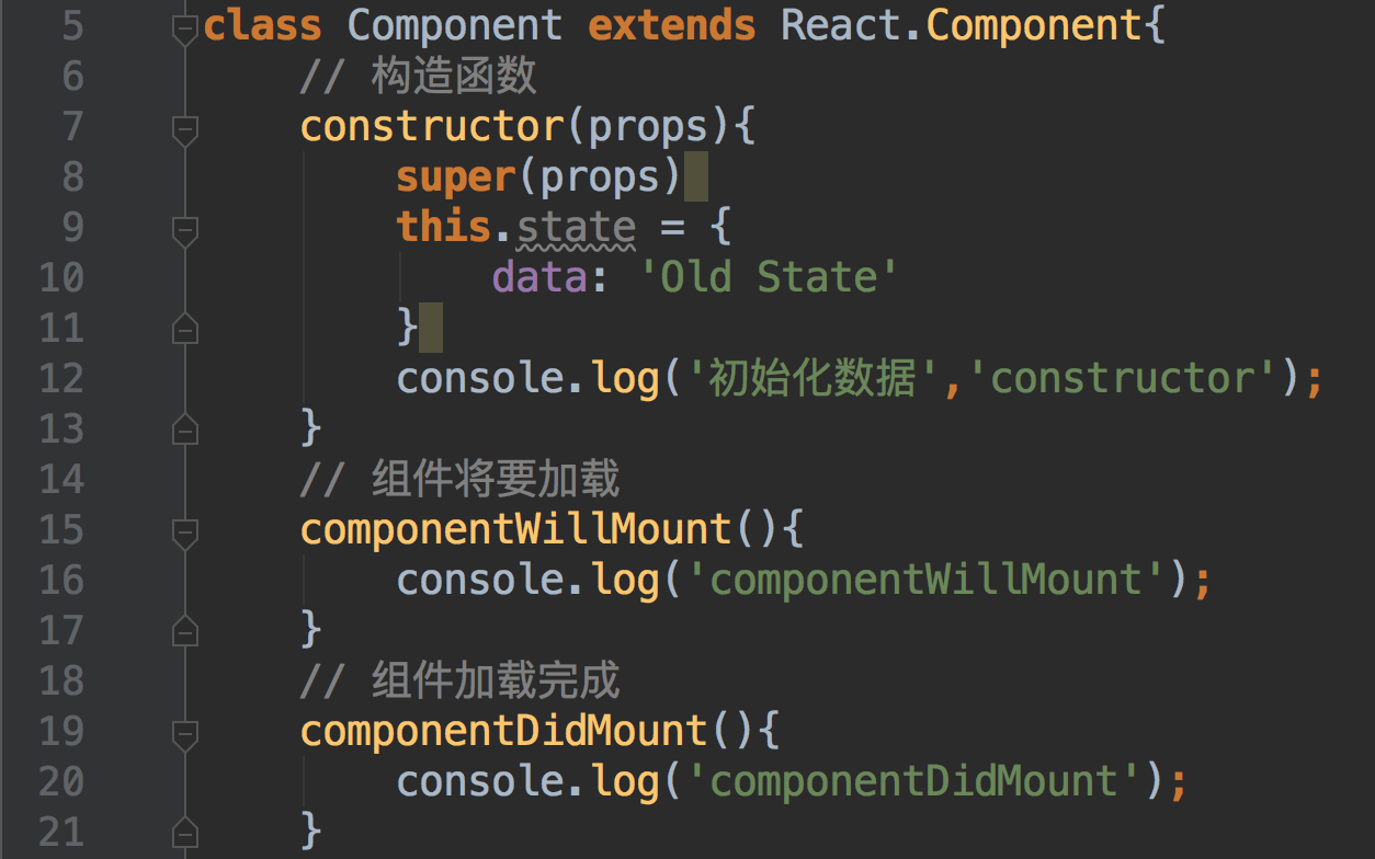 class Component extends React.Component{ // 构造函数 constructor(props){ super(props) this.state = { data: 'Old State' } console.log('初始化数据','constructor'); } // 组件将要加载 componentWillMount(){ console.log('componentWillMount'); } // 组件加载完成 componentDidMount(){ console.log('componentDidMount'); } // 将要接收父组件传来的props componentWillReceiveProps(){ console.log('componentWillReceiveProps'); } // 子组件是不是应该更新 shouldComponentUpdate(){ console.log('shouldComponentUpdate'); return true; } // 组件将要更新 componentWillUpdate(){ console.log('componentWillUpdate'); } // 组件更新完成 componentDidUpdate(){ console.log('componentDidUpdate'); } // 组件即将销毁 componentWillUnmount(){ console.log('componentWillUnmount'); } // 处理点击事件 handleClick(){ console.log('更新数据:'); this.setState({ data: 'New State' }); } // 渲染 render(){ console.log('render') return ( <div> <div>Props: {this.props.data}</div> <button onClick={()=>{this.handleClick()}}>更新组件</button> </div> ); }