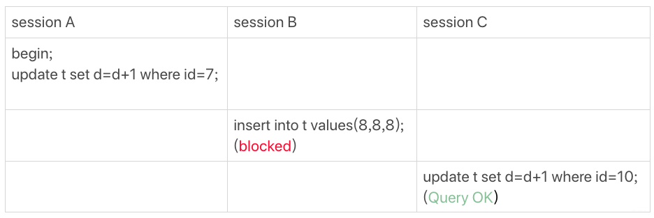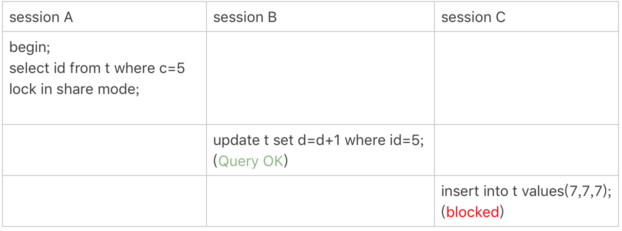 在最后的案例中,你可以清楚地知道next-key lock实际上是由间隙锁加行锁实现的。如果切换到读提交隔离级别(read-committed)的话,就好理解了,过程中去掉间隙锁的部分,也就是只剩下行锁的部分。