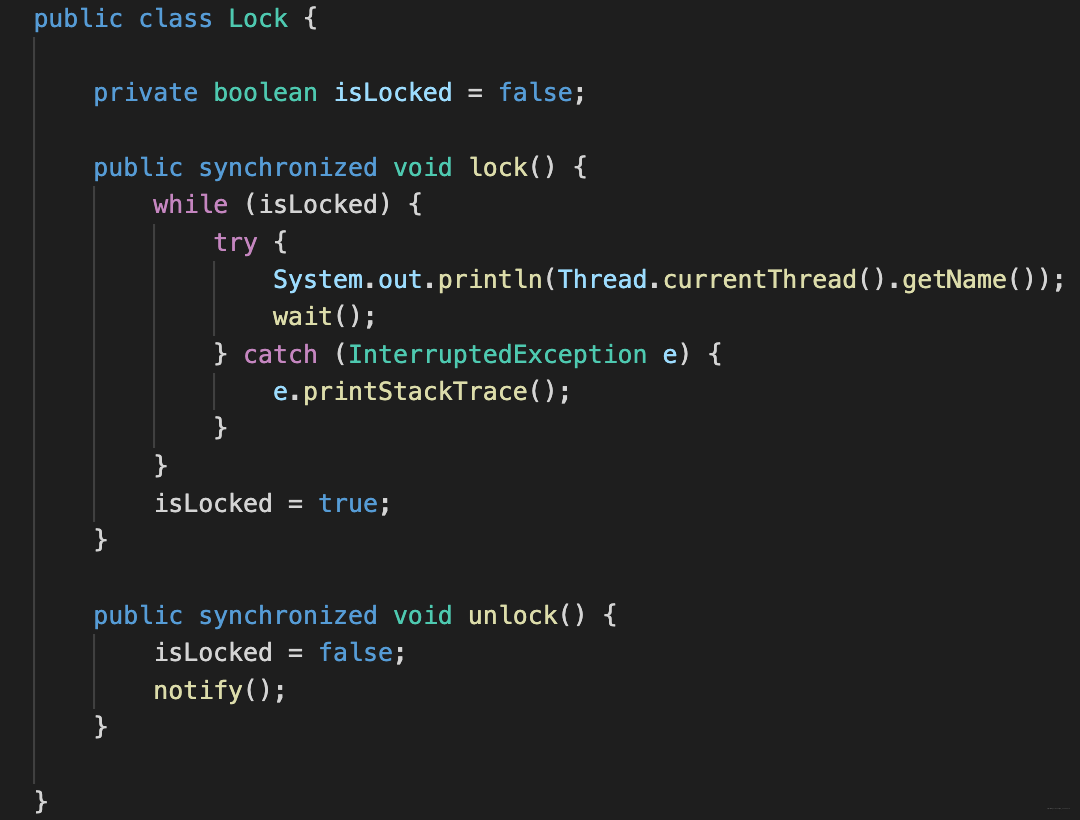 设计两个线程调⽤ call() ⽅法,第⼀个线程调⽤ call() ⽅法获取锁,进⼊ lock() ⽅法,由于初始 lockedBy 是 null,所以不会进⼊ while ⽽挂起当前线程,⽽是增量 lockedCount 并记录 lockBy 为第 ⼀个线程。
