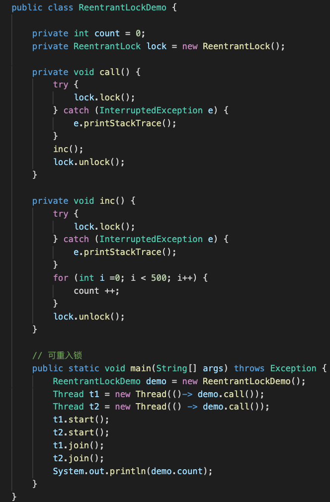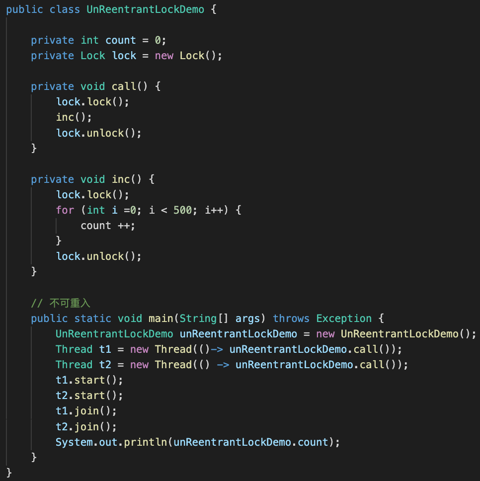 当前线程执⾏ call() ⽅法⾸先获取 lock,接下来执⾏ inc() ⽅法就⽆法执⾏ inc() 中的逻辑,必须先释放锁。该例很好的说明了不可重⼊锁。