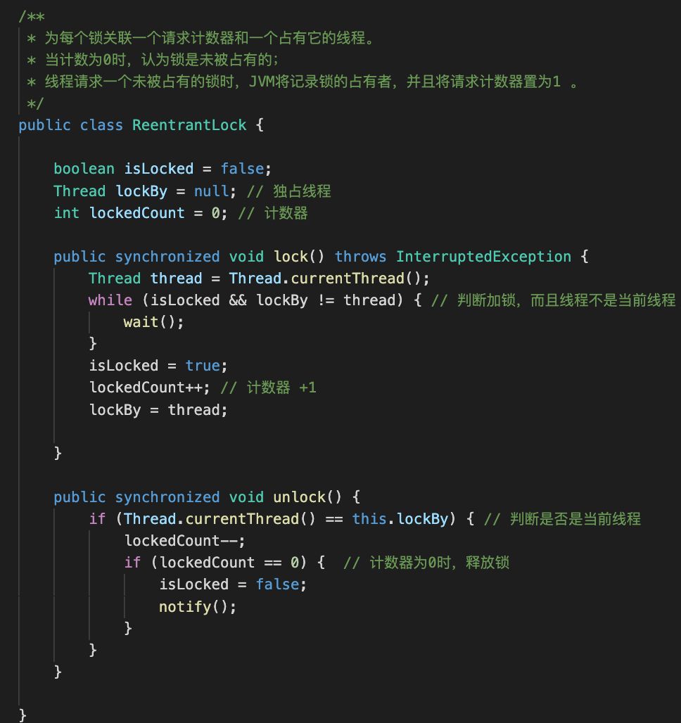 接着第⼀个线程进⼊ inc() ⽅法,由于同⼀进程,所以不会进⼊ while ⽽挂起,接着增量 lockedCount,当第⼆个线程尝试 lock,由于 isLocked=true, 所以他不会获取该锁,直到第⼀个线程调⽤两次 unlock() 将 lockCount 递减为 0,才将标记为 isLocked 设置为 false。