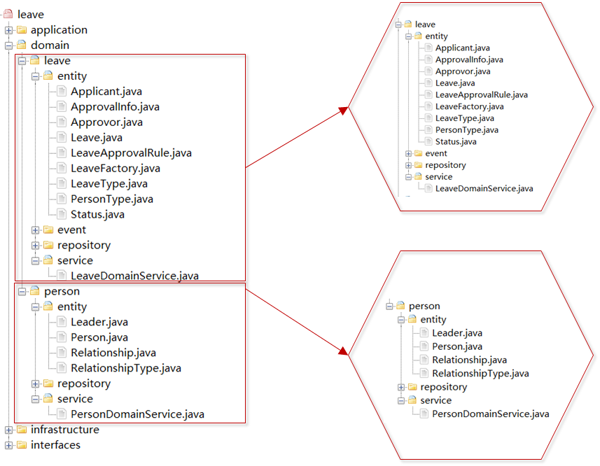 可见微服务里包含两个聚合的业务逻辑,两个聚合分别内聚了各自不同的业务能力,聚合内的代码分别归到了不同的聚合目录下。