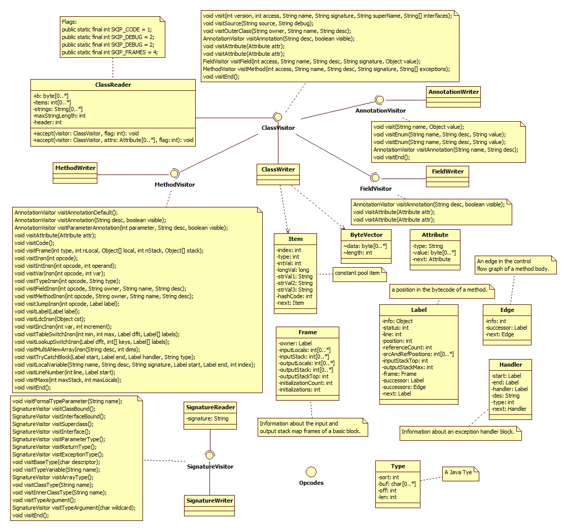 主要有以下几个类、接口(org.objectweb.asm包):