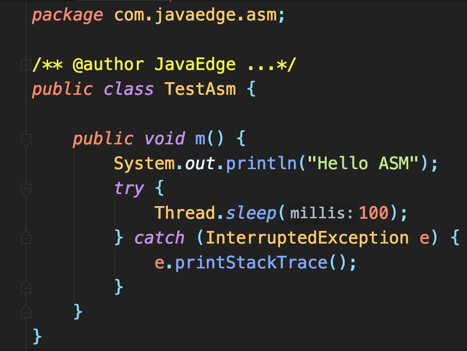 ... mv.visitMethodInsn(INVOKESTATIC, "java/lang/System", "currentTimeMillis", "()J", false); mv.visitVarInsn(LSTORE, 1); ... mv.visitFieldInsn(GETSTATIC, "java/lang/System", "out", "Ljava/io/PrintStream;"); mv.visitLdcInsn("Hello ASM"); mv.visitMethodInsn(INVOKEVIRTUAL, "java/io/PrintStream", "println", "(Ljava/lang/String;)V", false); mv.visitLabel(l0); mv.visitLineNumber(13, l0); mv.visitLdcInsn(new Long(100L)); mv.visitMethodInsn(INVOKESTATIC, "java/lang/Thread", "sleep", "(J)V", false); mv.visitLabel(l1); mv.visitLineNumber(16, l1); Label l5 = new Label(); mv.visitJumpInsn(GOTO, l5); mv.visitLabel(l2); mv.visitLineNumber(14, l2); mv.visitFrame(Opcodes.F_FULL, 2, new Object[]{"com/javaedge/asm/TestAsm", Opcodes.LONG}, 1, new Object[]{"java/lang/InterruptedException"}); mv.visitVarInsn(ASTORE, 3); Label l6 = new Label(); mv.visitLabel(l6); mv.visitLineNumber(15, l6); mv.visitVarInsn(ALOAD, 3); mv.visitMethodInsn(INVOKEVIRTUAL, "java/lang/InterruptedException", "printStackTrace", "()V", false); mv.visitLabel(l5); mv.visitLineNumber(17, l5); mv.visitFrame(Opcodes.F_SAME, 0, null, 0, null); mv.visitMethodInsn(INVOKESTATIC, "java/lang/System", "currentTimeMillis", "()J", false); mv.visitVarInsn(LSTORE, 3); Label l7 = new Label(); mv.visitLabel(l7); mv.visitLineNumber(18, l7); mv.visitFieldInsn(GETSTATIC, "java/lang/System", "out", "Ljava/io/PrintStream;"); mv.visitTypeInsn(NEW, "java/lang/StringBuilder"); mv.visitInsn(DUP); mv.visitMethodInsn(INVOKESPECIAL, "java/lang/StringBuilder", "<init>", "()V", false); mv.visitLdcInsn("m\u65b9\u6cd5\u6267\u884c\u65f6\u95f4: "); mv.visitMethodInsn(INVOKEVIRTUAL, "java/lang/StringBuilder", "append", "(Ljava/lang/String;)Ljava/lang/StringBuilder;", false); mv.visitVarInsn(LLOAD, 3); mv.visitVarInsn(LLOAD, 1); mv.visitInsn(LSUB); mv.visitMethodInsn(INVOKEVIRTUAL, "java/lang/StringBuilder", "append", "(J)Ljava/lang/StringBuilder;", false); mv.visitMethodInsn(INVOKEVIRTUAL, "java/lang/StringBuilder", "toString", "()Ljava/lang/String;", false); mv.visitMethodInsn(INVOKEVIRTUAL, "java/io/PrintStream", "println", "(Ljava/lang/String;)V", false); Label l8 = new Label(); mv.visitLabel(l8); mv.visitLineNumber(19, l8); mv.visitInsn(RETURN); Label l9 = new Label(); mv.visitLabel(l9); mv.visitLocalVariable("e", "Ljava/lang/InterruptedException;", null, l6, l5, 3); mv.visitLocalVariable("this", "Lcom/javaedge/asm/TestAsm;", null, l3, l9, 0); mv.visitLocalVariable("start", "J", null, l4, l9, 1); mv.visitLocalVariable("end", "J", null, l7, l9, 3); mv.visitMaxs(6, 5); mv.visitEnd(); } cw.visitEnd(); return cw.toByteArray(); }