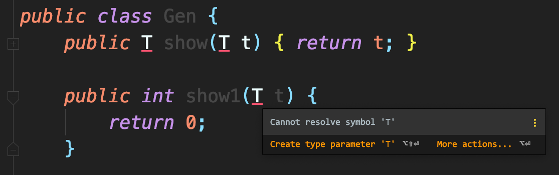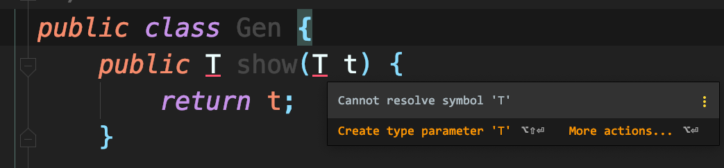 相反的,在使用自定义的范型T之前,如果不首先使用<T>来声明范型变量的存在的话,编译器会有错误提示: