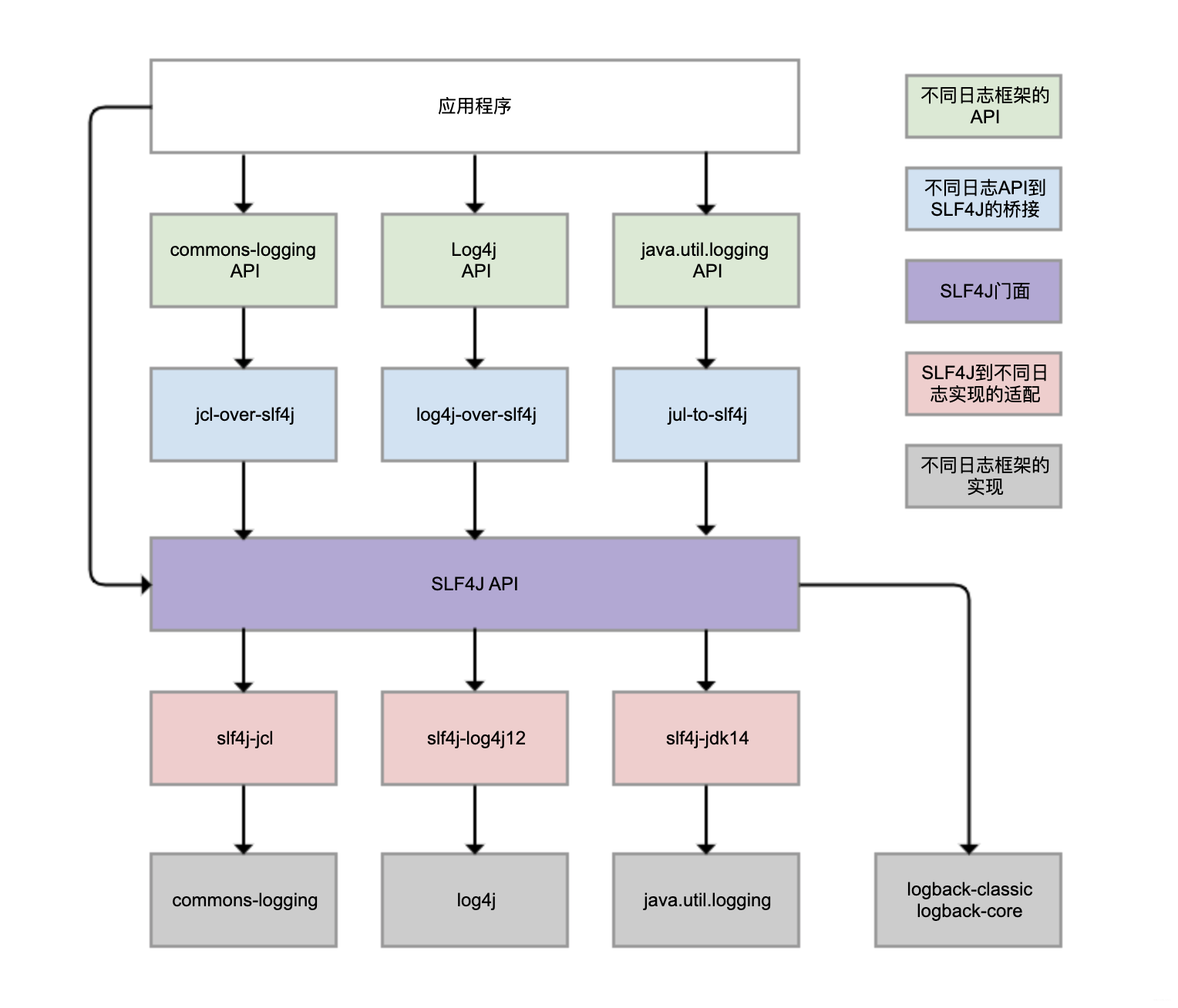 - 提供统一的日志门面API,即图中紫色部分,实现中立的日志记录API