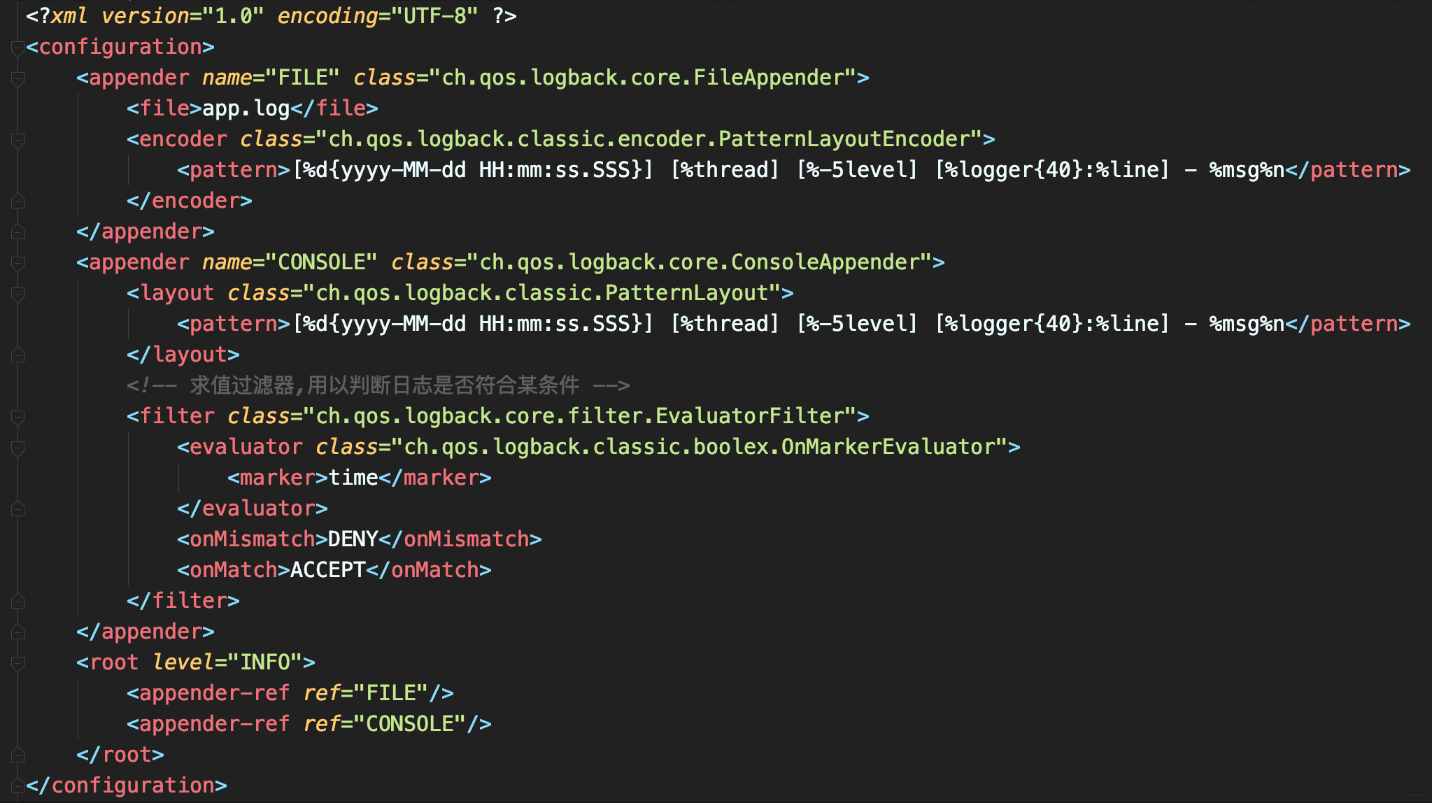把大量日志输出到文件中,日志文件会非常大,如果性能测试结果也混在其中的话,就很难找到那条日志。所以,这里使用EvaluatorFilter对日志按照标记进行过滤,并将过滤出的日志单独输出到控制台上。该案例中给输出测试结果的那条日志上做了time标记。