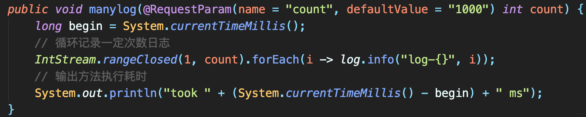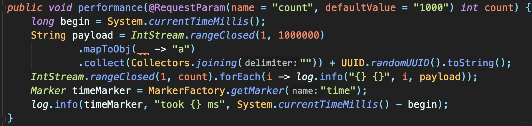 - 测试代码:实现记录指定次数的大日志,每条日志包含1MB字节的模拟数据,最后记录一条以time为标记的方法执行耗时日志: