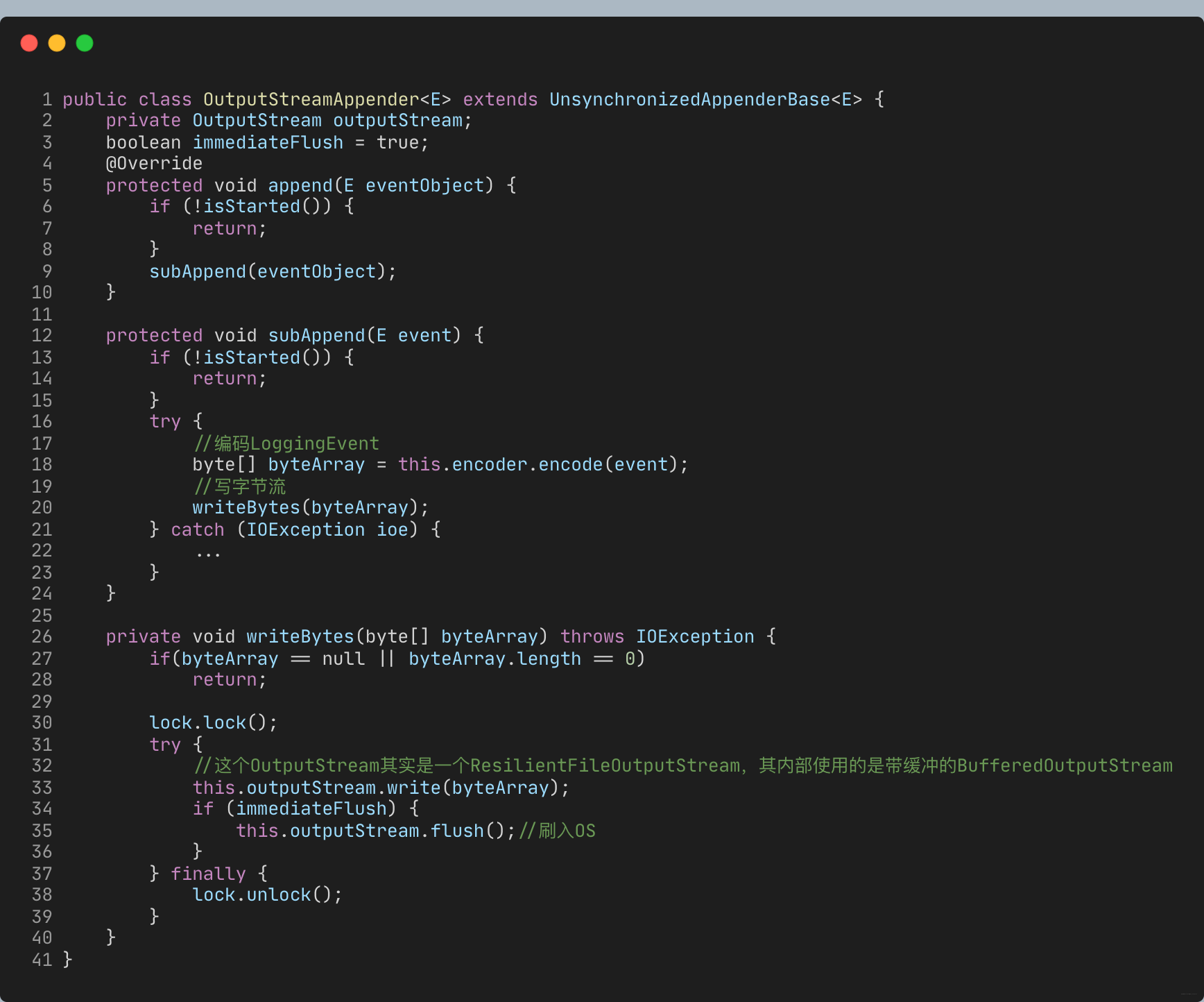 在追加日志时,是直接把日志写入OutputStream中,属同步记录日志