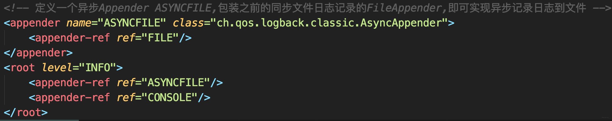 定义一个异步Appender ASYNCFILE,包装之前的同步文件日志记录的FileAppender, 即可实现异步记录日志到文件