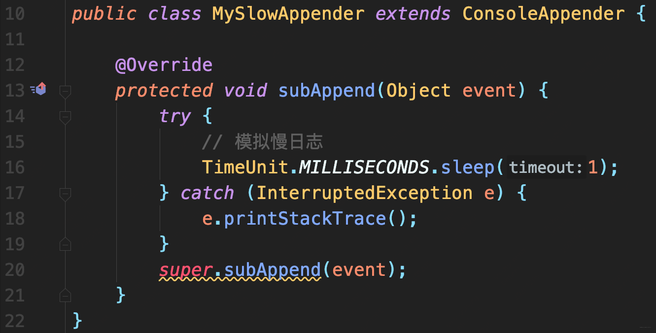 首先,自定义一个继承自ConsoleAppender的MySlowAppender,作为记录到控制台的输出器,写入日志时休眠1秒。