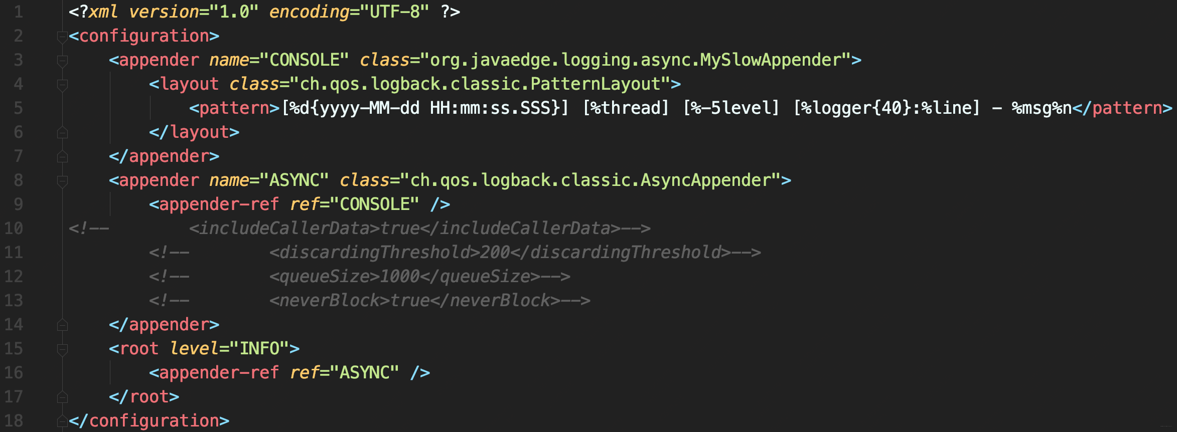 配置文件中使用AsyncAppender,将MySlowAppender包装为异步日志记录