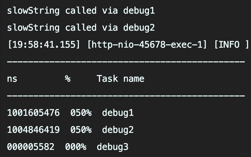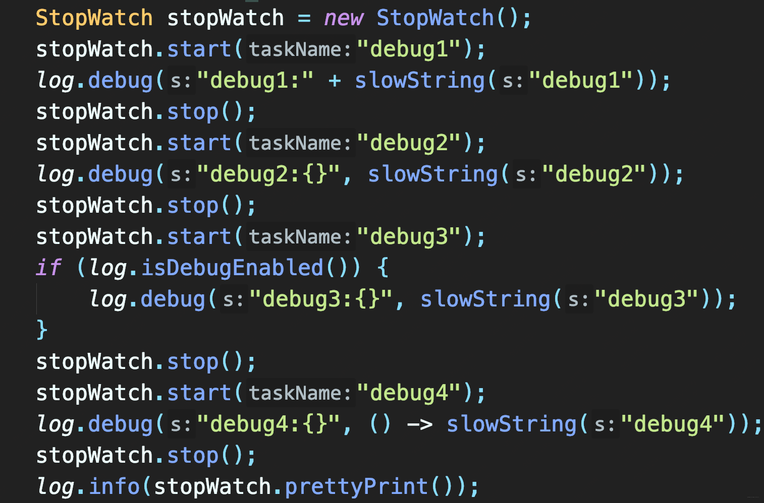 前俩方式都调用slowString,所以都耗时1s。且方式二就是使用占位符记录slowString,这种方式虽允许传Object,不显式拼接String,但也只是延迟(若日志不记录那就是省去)日志参数对象.toString()和字符串拼接的耗时。