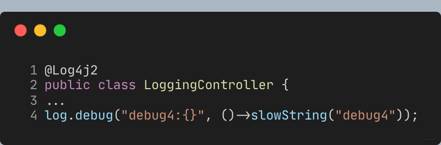 除事先判断日志级别,还可通过lambda表达式延迟参数内容获取。但SLF4J的API还不支持lambda,因此需使用Log4j2日志API,把Lombok的@Slf4j注解替换为**@Log4j2**注解,即可提供lambda表达式参数的方法: