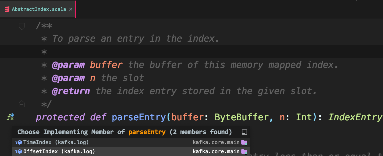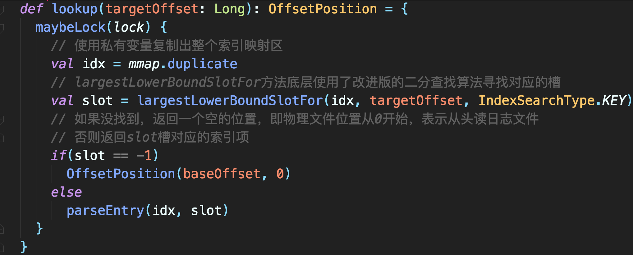 OffsetIndex被用来快速定位消息所在的物理文件位置,那么必然需定义一个方法执行对应的查询逻辑。这个方法就是lookup。
