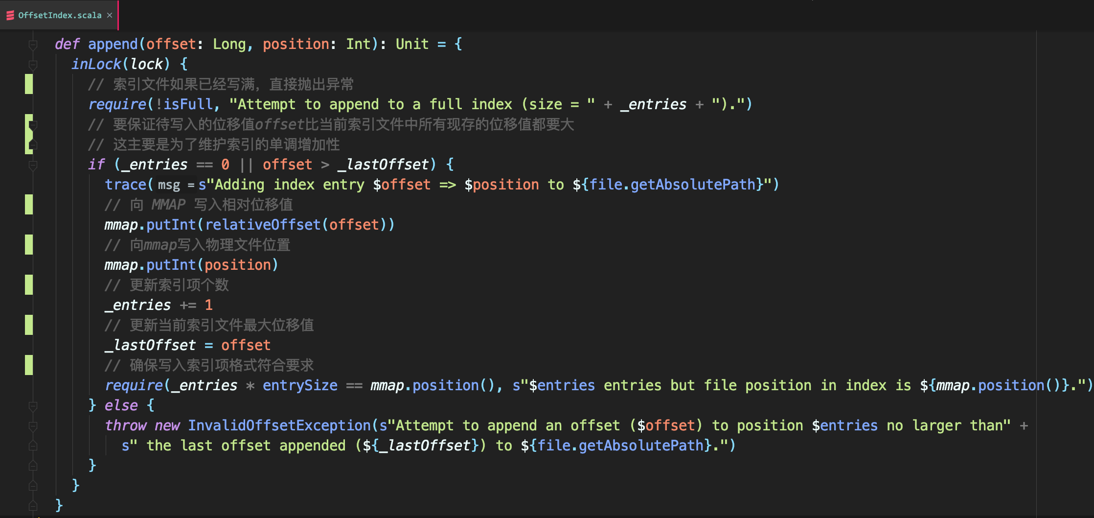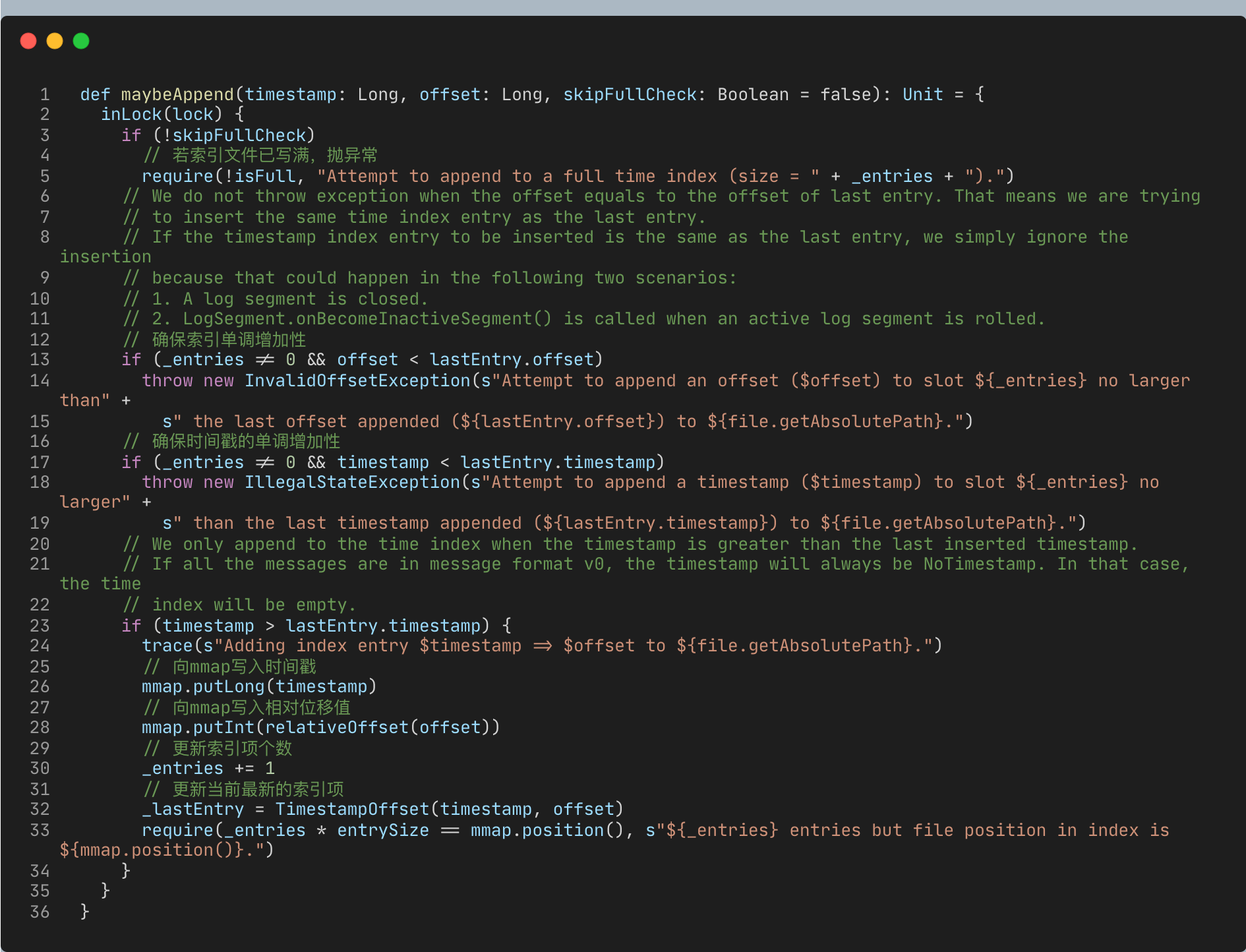 向TimeIndex写索引的主体逻辑,是向mmap分别写入时间戳和相对偏移值。