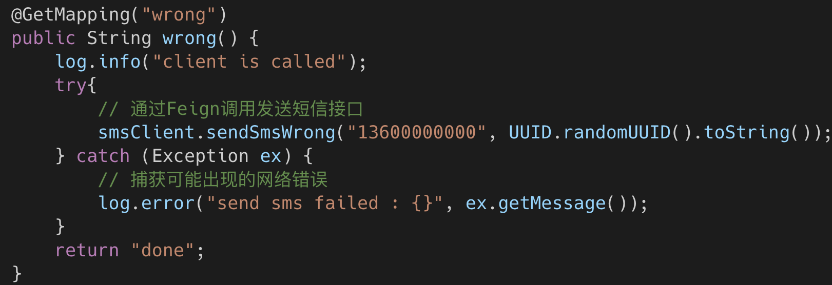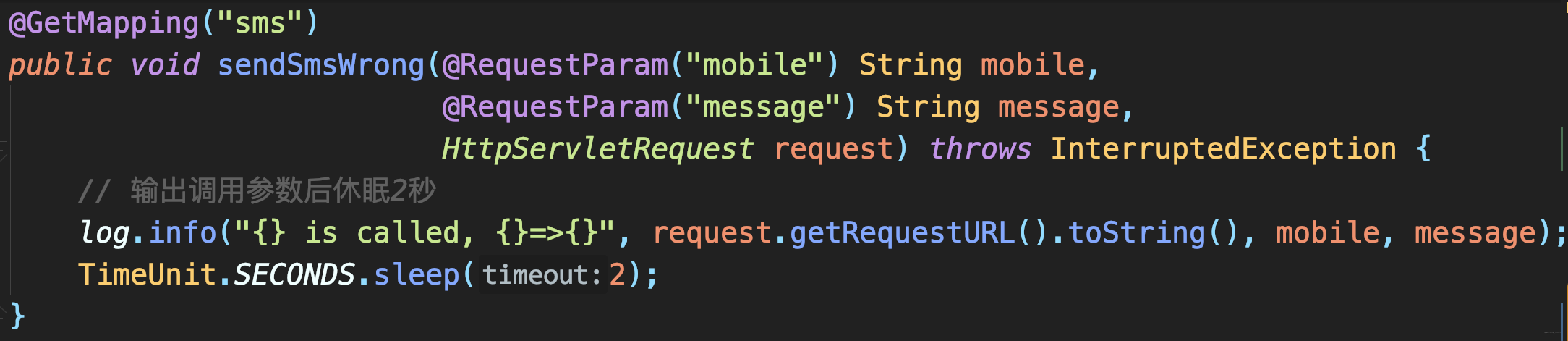 - Get请求的发送短信接口,休眠2s以模拟耗时: