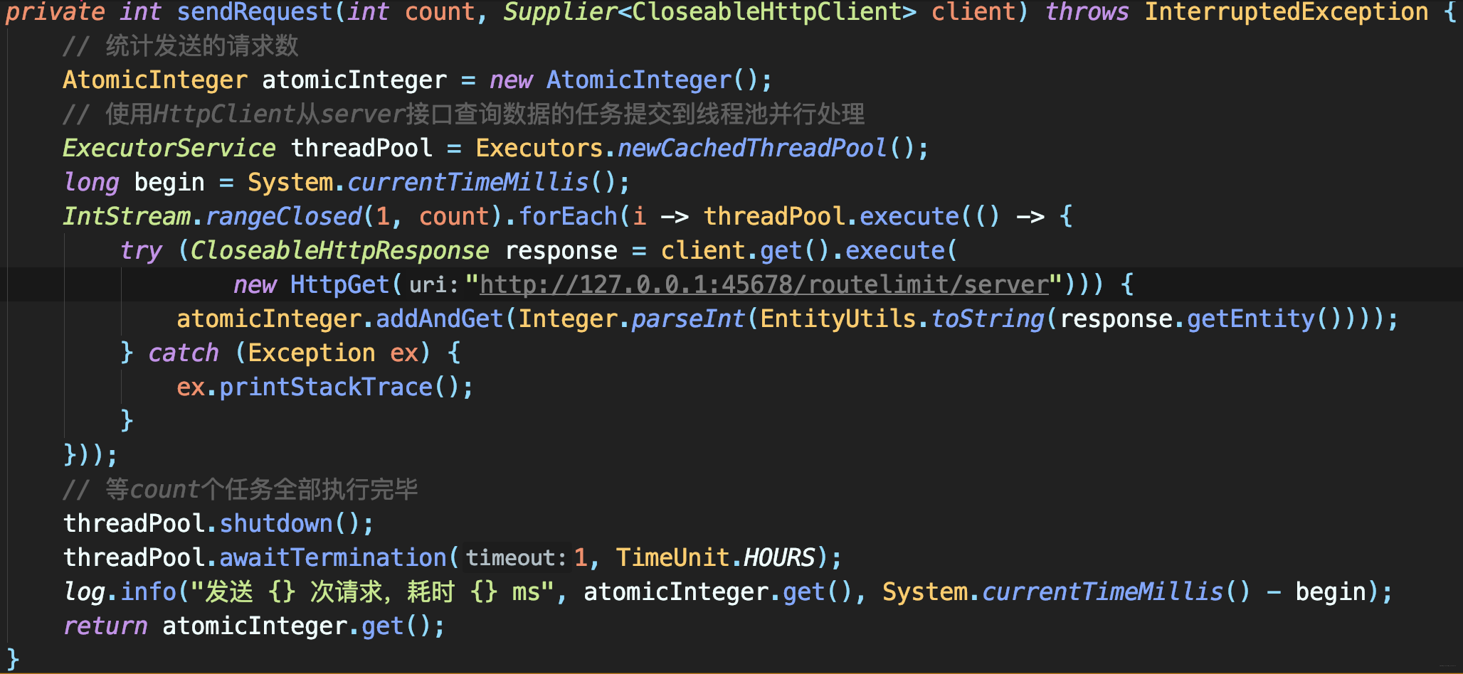 爬虫需多次调用该接口抓取数据,为确保线程池不是并发瓶颈,使用了一个无线程上限的newCachedThreadPool,然后使用HttpClient执行HTTP请求,把请求任务循环提交到线程池处理,最后等待所有任务执行完成后输出执行耗时: