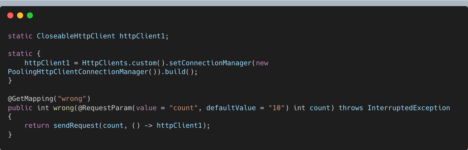 尝试声明一个新的HttpClient放开相关限制,设置maxPerRoute为50、maxTotal为100,然后修改一下刚才的wrong方法,使用新的客户端进行测试: