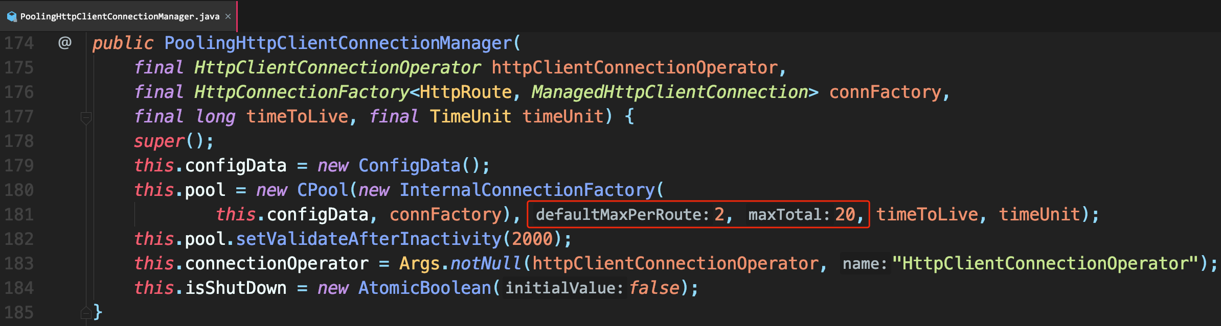 PoolingHttpClientConnectionManager源码有两个重要参数: