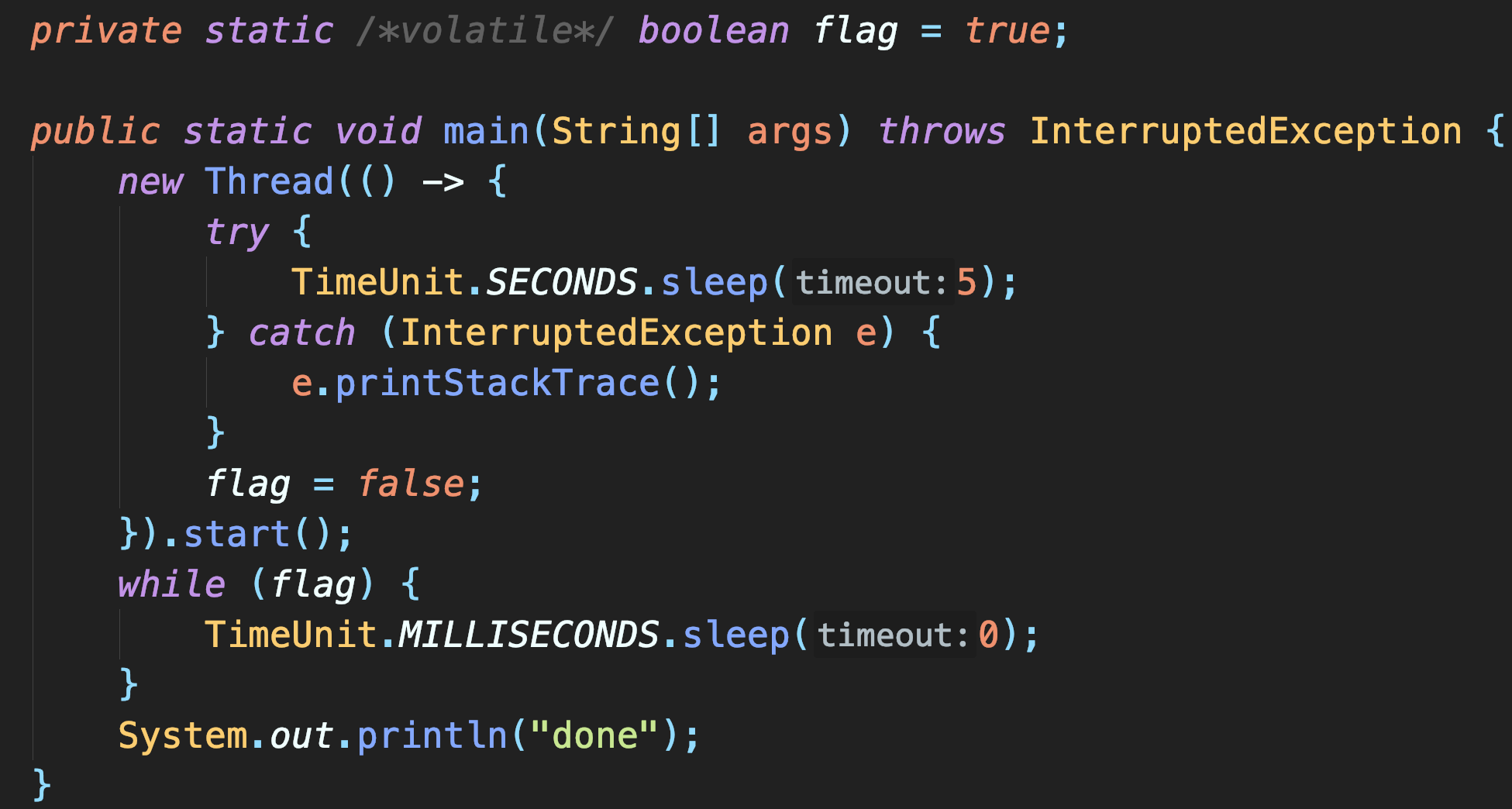所以不能退出。必须加volatile,因为volatile保证了可见性。改完后会强制让工作内存失效,去主存拿。如果不加volatile的话那么在while true里面添加输出语句也是OK的。因为println源码加锁了,sync会让当前线程的工作内存失效。