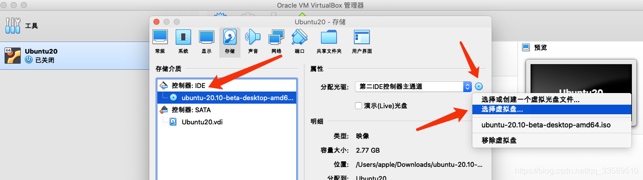 选择存储,再选控制器IDE,点击右边icon进入文件查找,可选择iso文件~