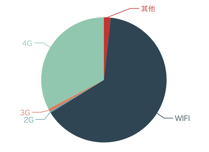 一般是用来监控占比分布的,比如下面这张饼图展示了使用不同的手机网络占比情况,可见Wi-Fi和4G的占比明显要高于3G和2G。
