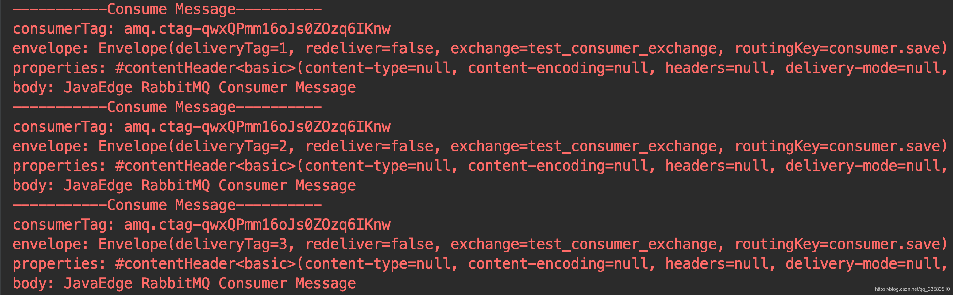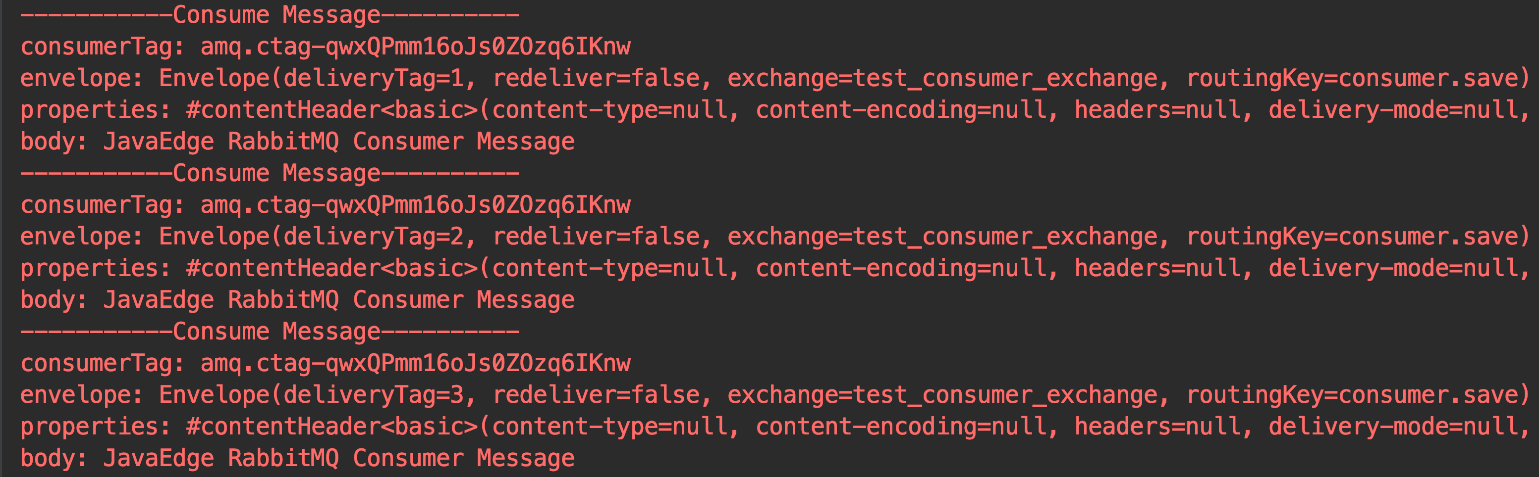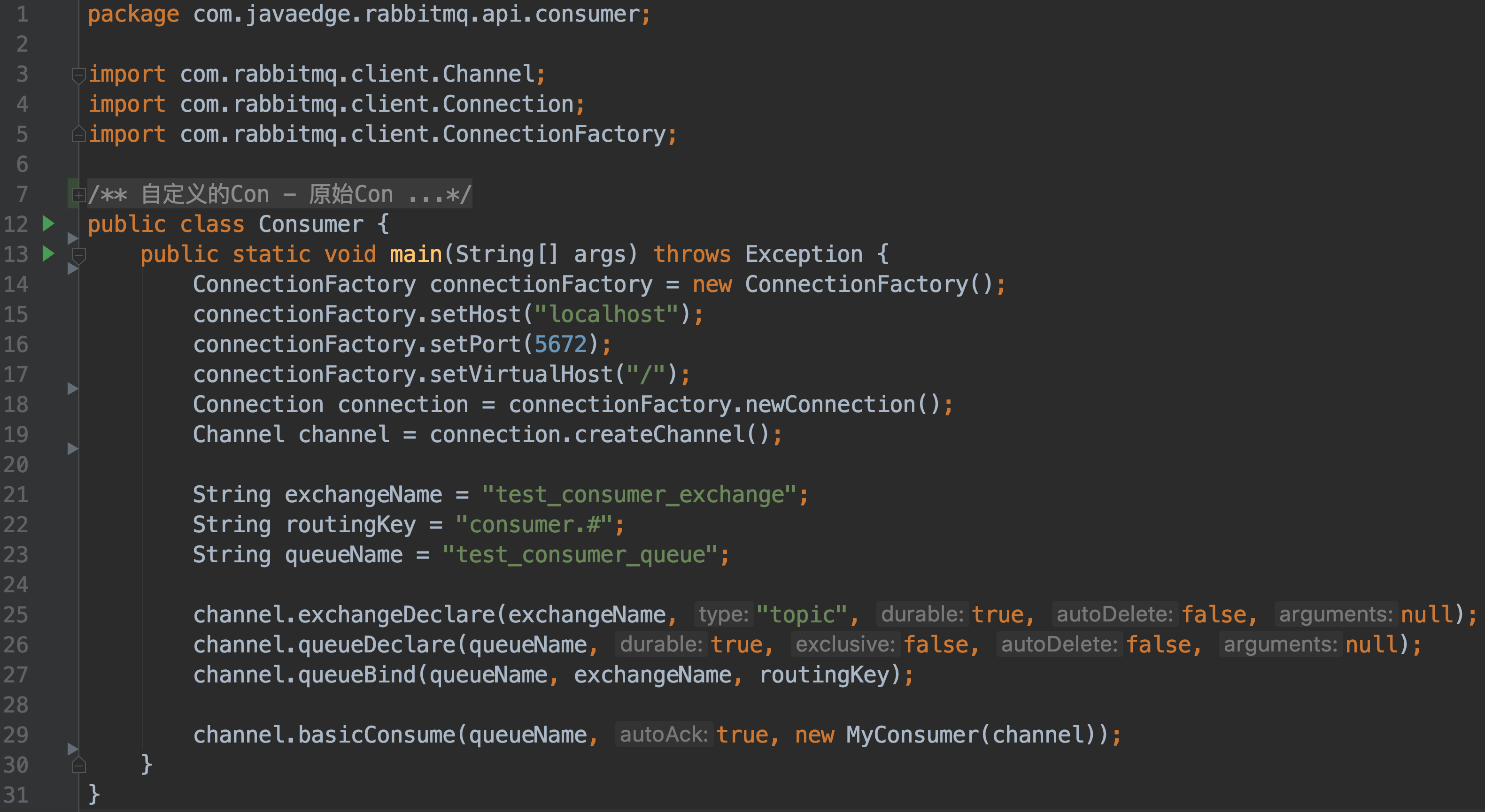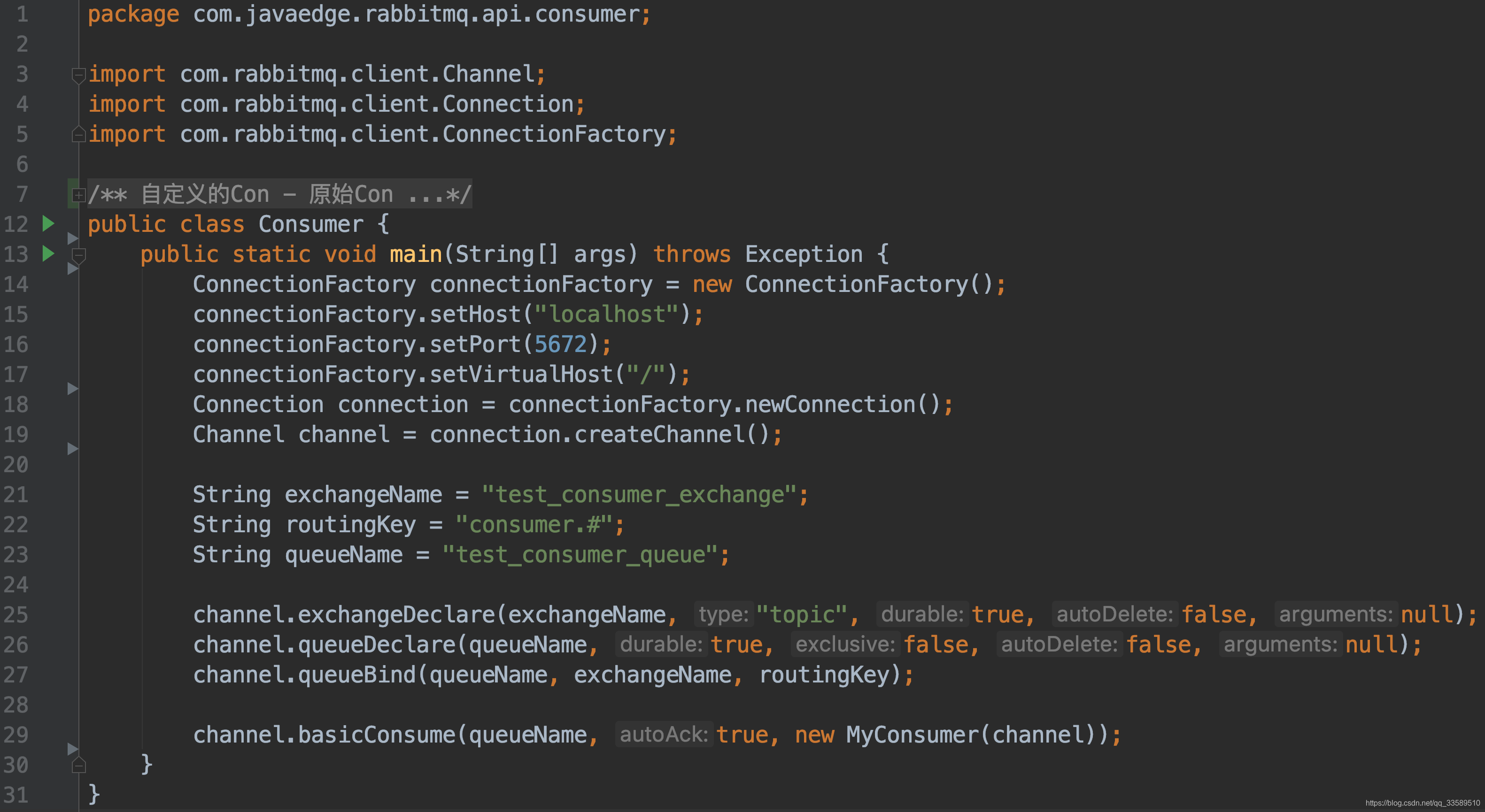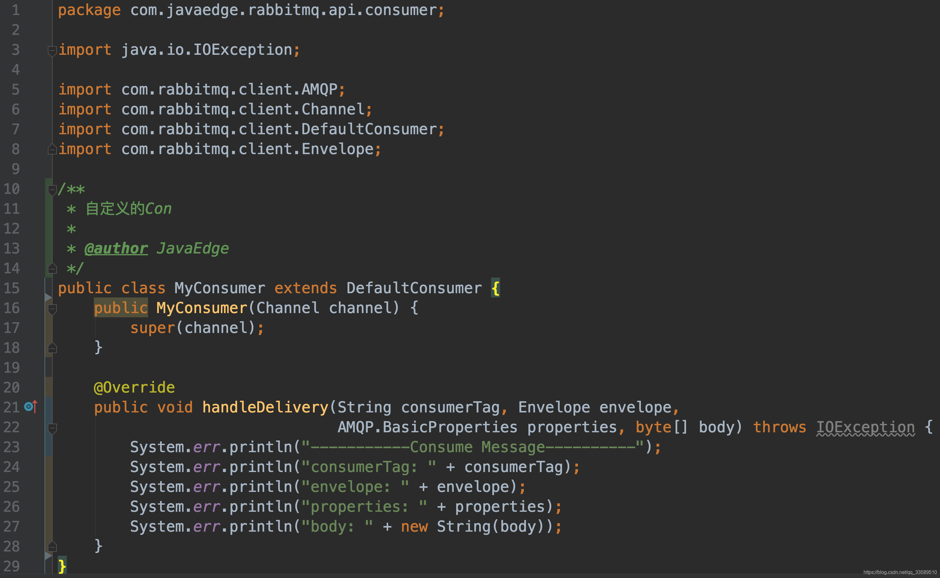 自定义Con实现只需要继承 DefaultConsumer 类,重写 handleDelivery 方法即可。