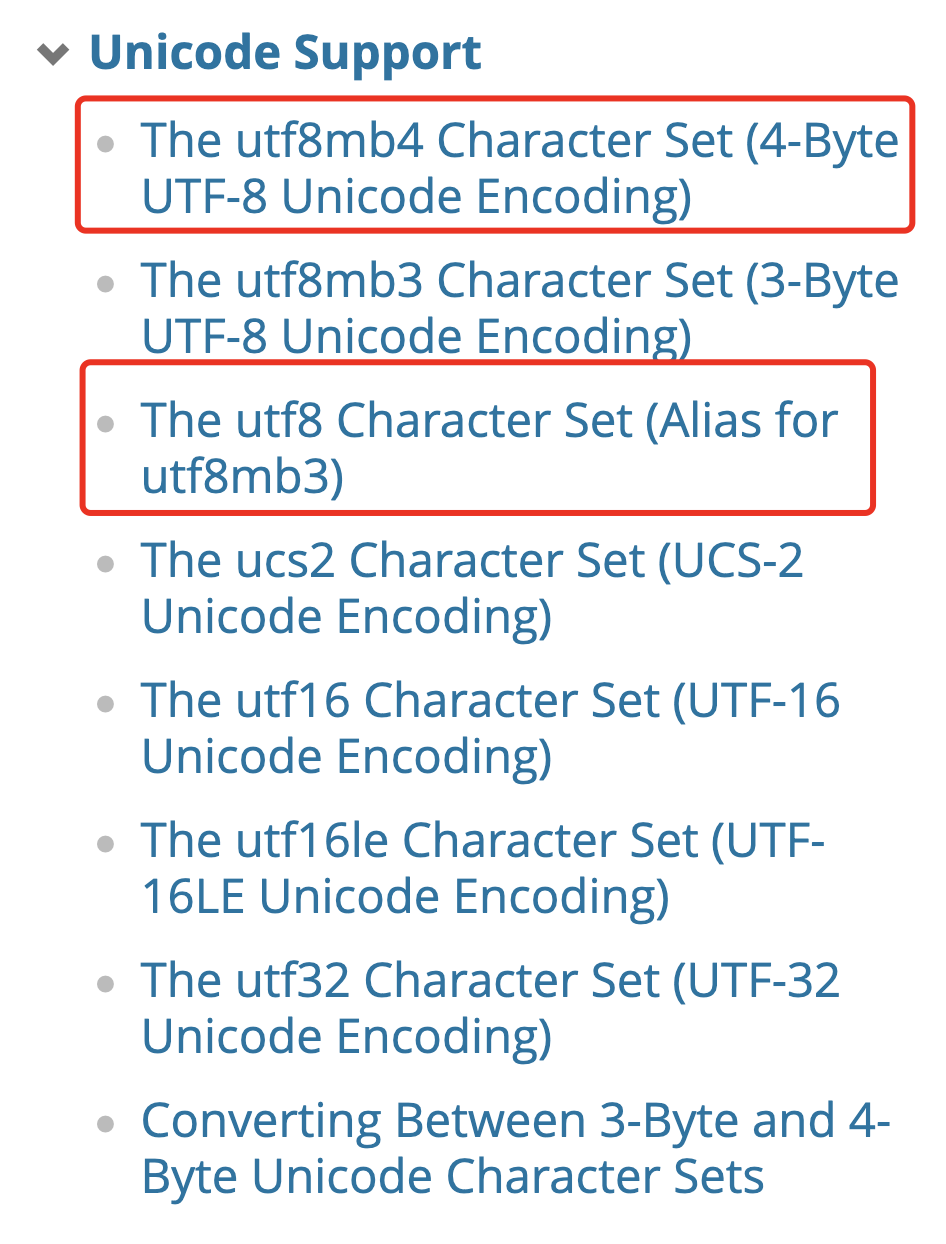 - MySQL一直没有修复这个bug,他们在2010年发布了一个叫作“utf8mb4”的字符集,绕过这个问题。