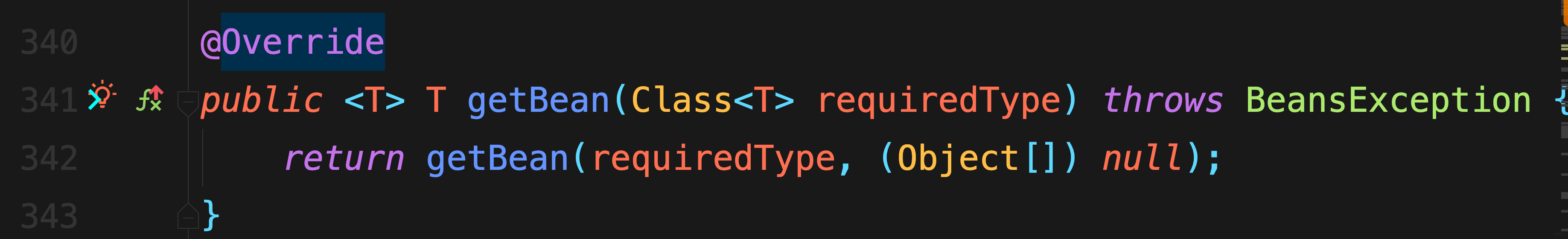 先从getBean这个方法看起,在Spring的AbstractApplicationContext中有很多重载的getBean方法,这里调用根据Type(Class类型)来获取的Bean信息。我们传入type是FactoryBeanService类型。