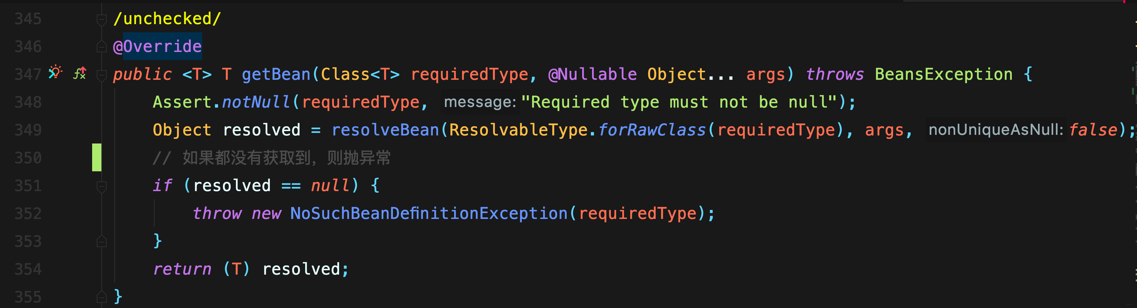 private <T> T resolveBean(ResolvableType requiredType, @Nullable Object[] args, boolean nonUniqueAsNull) {