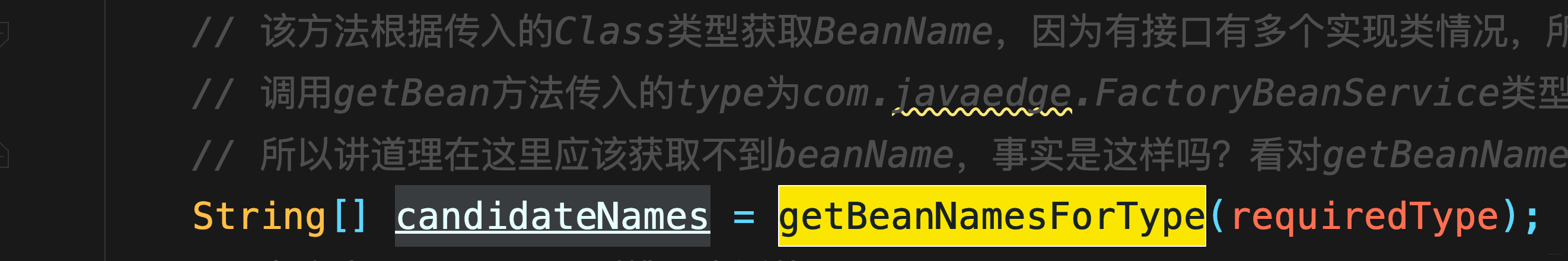 上面的代码中我们传入的type是com.javaedge.FactoryBeanService类型,但是在我们的Spring容器中却没有FactoryBeanService类型的Bean,那么我们是怎么从getBeanNamesForType获取到beanName的?