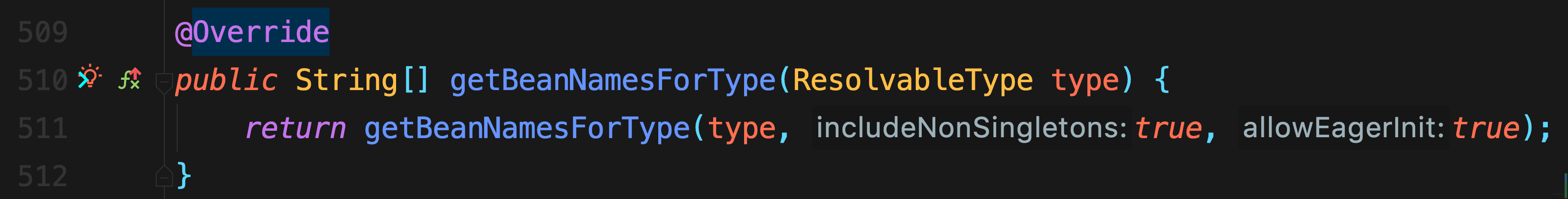 public String[] getBeanNamesForType(@Nullable Class<?> type, boolean includeNonSingletons, boolean allowEagerInit) {