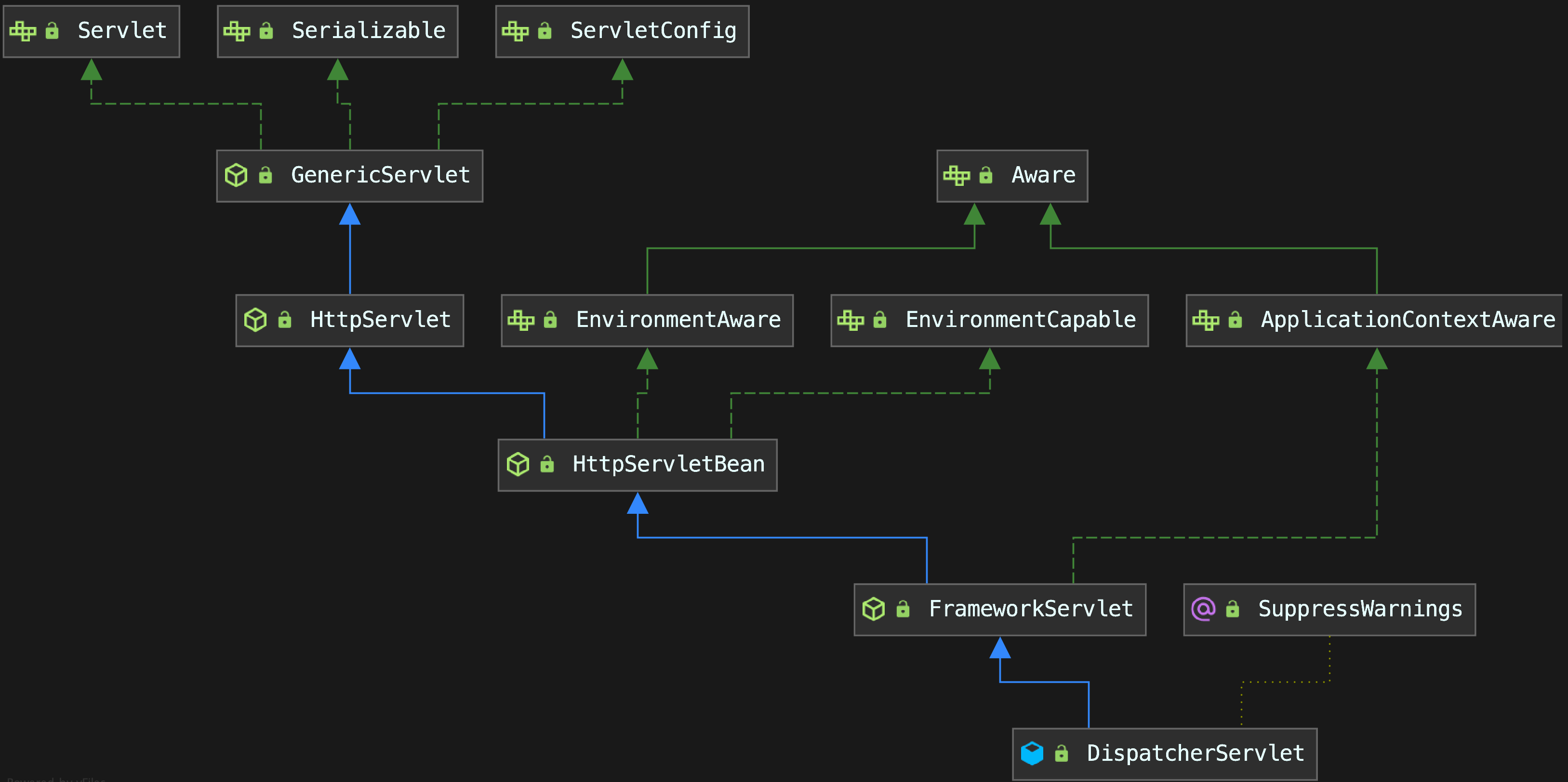 DispatcherServlet继承了FrameworkServlet,FrameworkServlet继承了HttpServletBean,HttpServletBean继承了HttpServlet,HttpServlet继承了GenericServlet,GenericServlet则实现了我们最顶级的接口Servlet和ServletConfig。