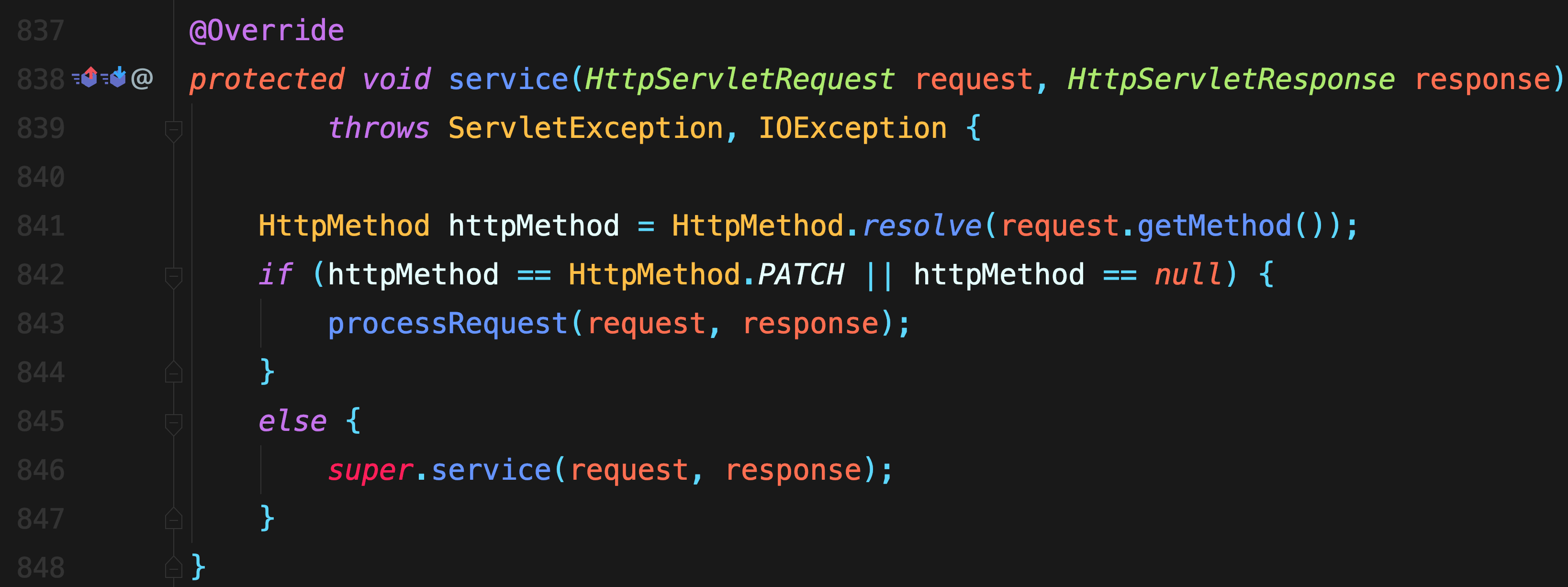HttpMethod这个定义了这样的几种枚举类型:GET, HEAD, POST, PUT, PATCH, DELETE, OPTIONS, TRACE;而这些也是RFC标准中几种请求类型。如果请求类型为PATCH或者没有找到相应的请求类型的话,则直接调用processRequest这个方法。但是这种情况我们很少很少会遇到。