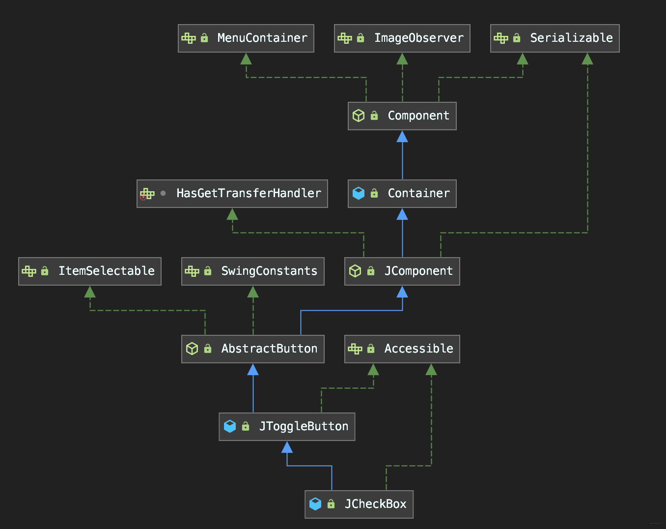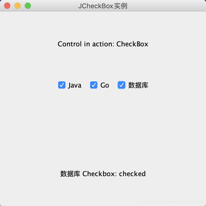 public class JCheckBoxExample { private JFrame mainFrame; private JLabel headerLabel; private JLabel statusLabel; private JPanel controlPanel; public JCheckBoxExample() { prepareGUI(); } public static void main(String[] args) { JCheckBoxExample swingControlDemo = new JCheckBoxExample(); swingControlDemo.showCheckBoxDemo(); } private void prepareGUI() { mainFrame = new JFrame("JCheckBox实例"); mainFrame.setSize(400, 400); mainFrame.setLayout(new GridLayout(3, 1)); mainFrame.addWindowListener(new WindowAdapter() { @Override public void windowClosing(WindowEvent windowEvent) { System.exit(0); } }); headerLabel = new JLabel("", JLabel.CENTER); statusLabel = new JLabel("", JLabel.CENTER); statusLabel.setSize(350, 100); controlPanel = new JPanel(); controlPanel.setLayout(new FlowLayout()); mainFrame.add(headerLabel); mainFrame.add(controlPanel); mainFrame.add(statusLabel); mainFrame.setVisible(true); } private void showCheckBoxDemo() { headerLabel.setText("Control in action: CheckBox"); final JCheckBox chkApple = new JCheckBox("Java"); final JCheckBox chkMango = new JCheckBox("Go"); final JCheckBox chkPeer = new JCheckBox("数据库"); chkApple.setMnemonic(KeyEvent.VK_C); chkMango.setMnemonic(KeyEvent.VK_M); chkPeer.setMnemonic(KeyEvent.VK_P); chkApple.addItemListener(e -> statusLabel.setText("Java Checkbox: " + (e.getStateChange() == 1 ? "checked" : "unchecked"))); chkMango.addItemListener(e -> statusLabel.setText("Go Checkbox: " + (e.getStateChange() == 1 ? "checked" : "unchecked"))); chkPeer.addItemListener(e -> statusLabel.setText("数据库 Checkbox: " + (e.getStateChange() == 1 ? "checked" : "unchecked"))); controlPanel.add(chkApple); controlPanel.add(chkMango); controlPanel.add(chkPeer); mainFrame.setVisible(true); }