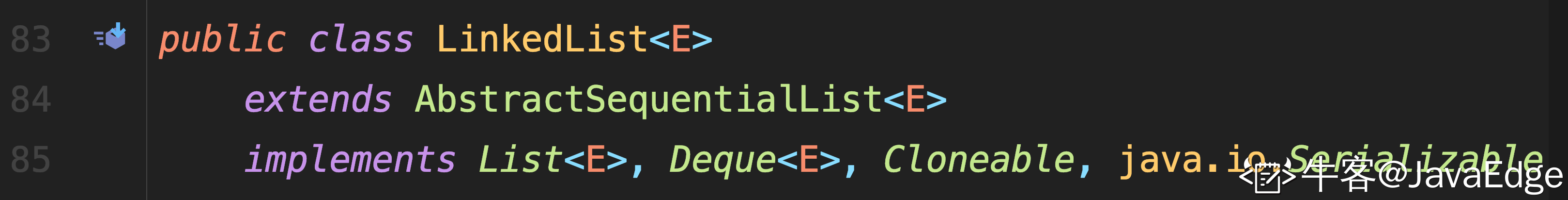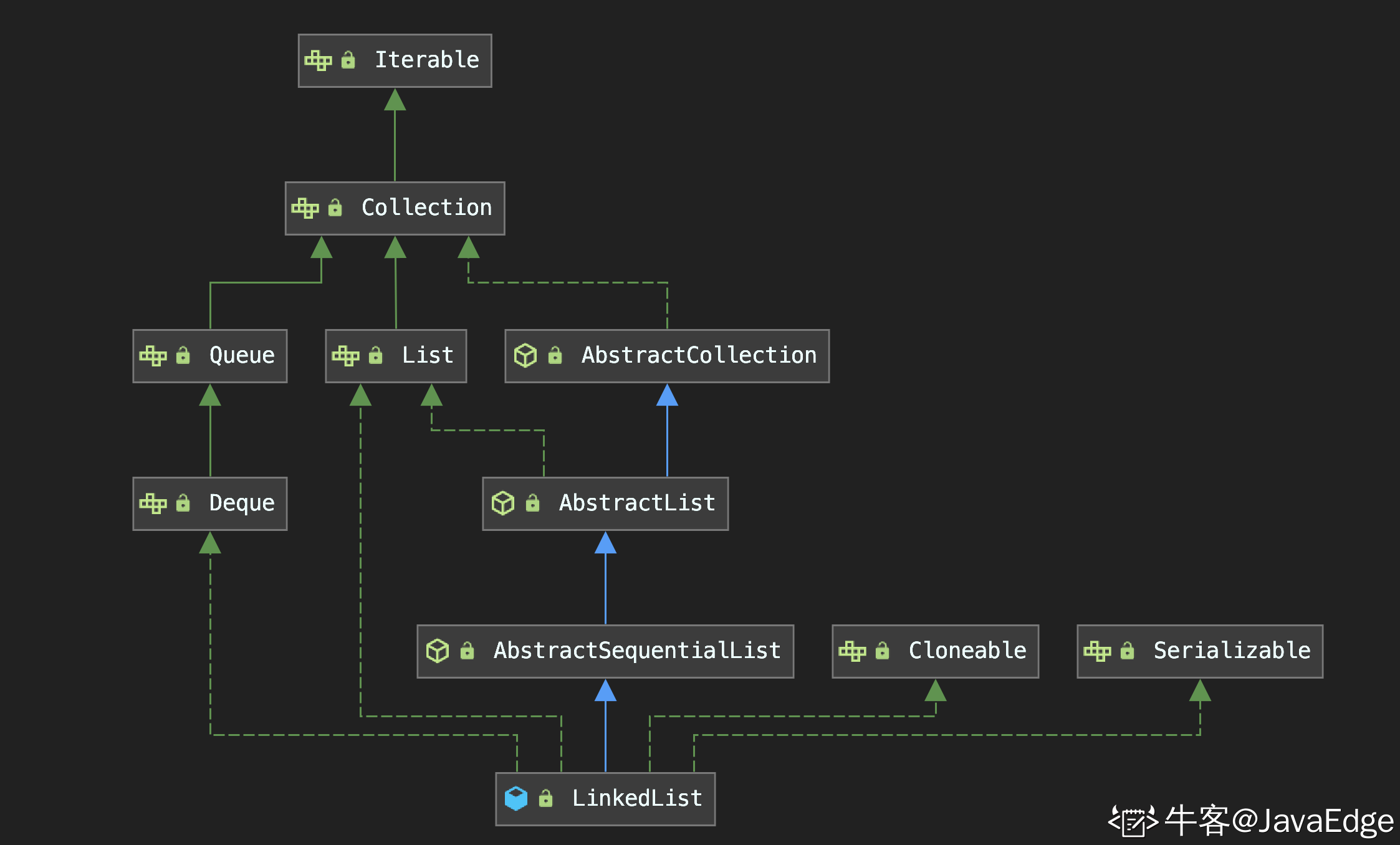 LinkedList 继承自 AbstractSequentialList,又实现了 List、Deque、Cloneable、Serializable等接口.