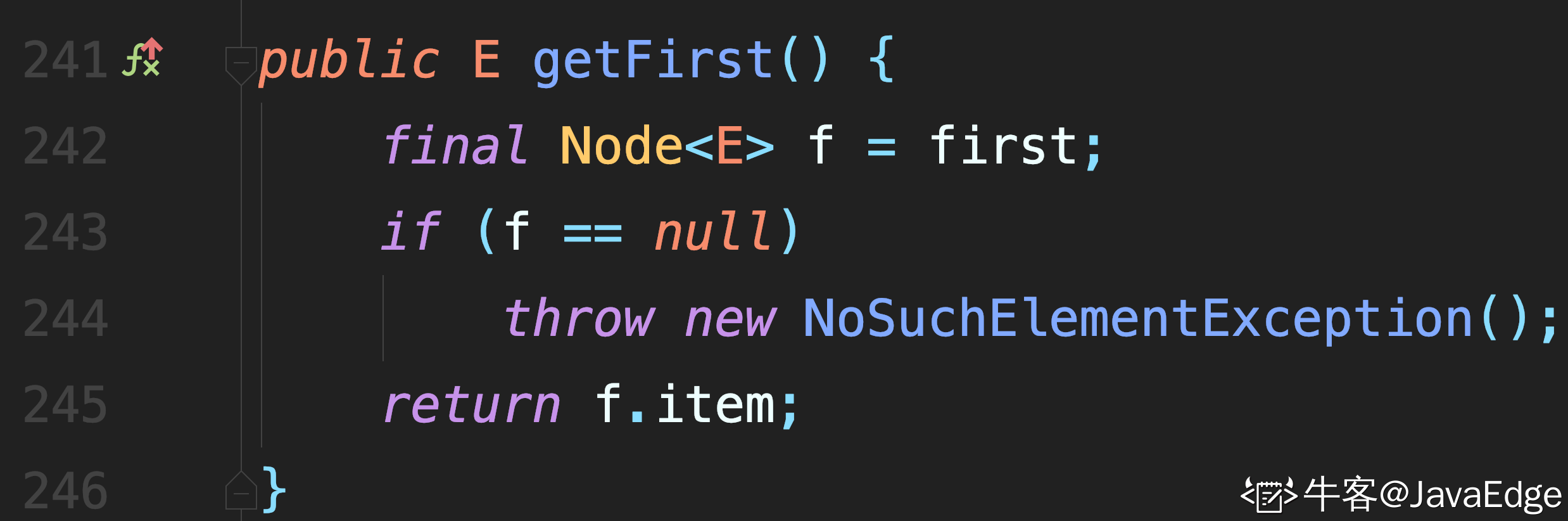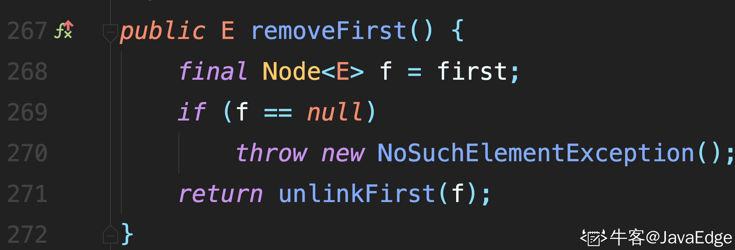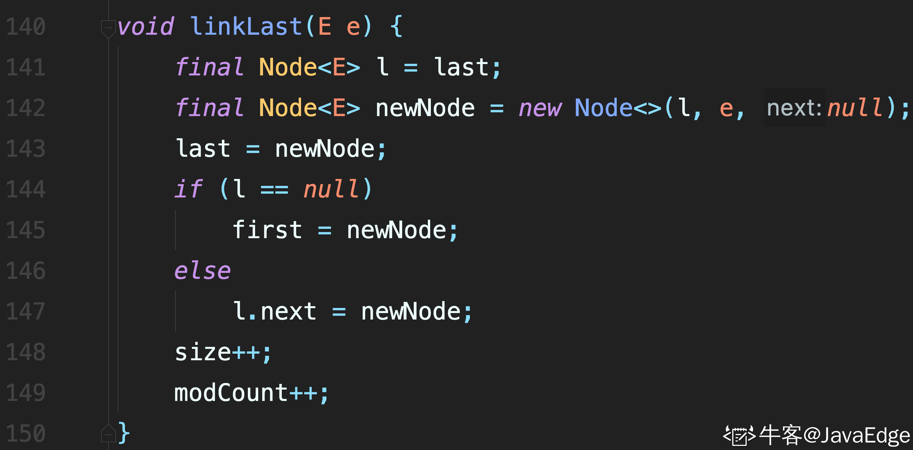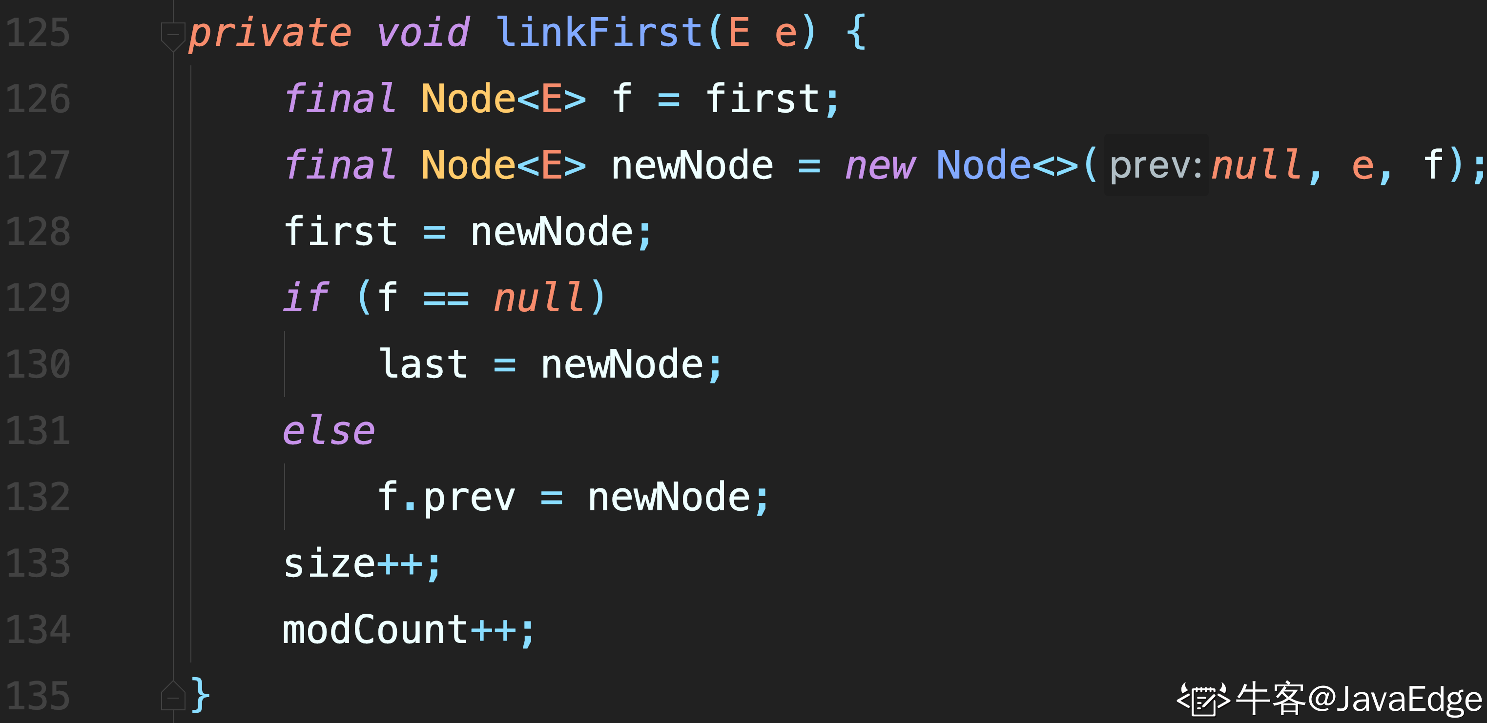 - 将插入元素封装成 newNode,并且该新节点的next指向原来的头节点,即f